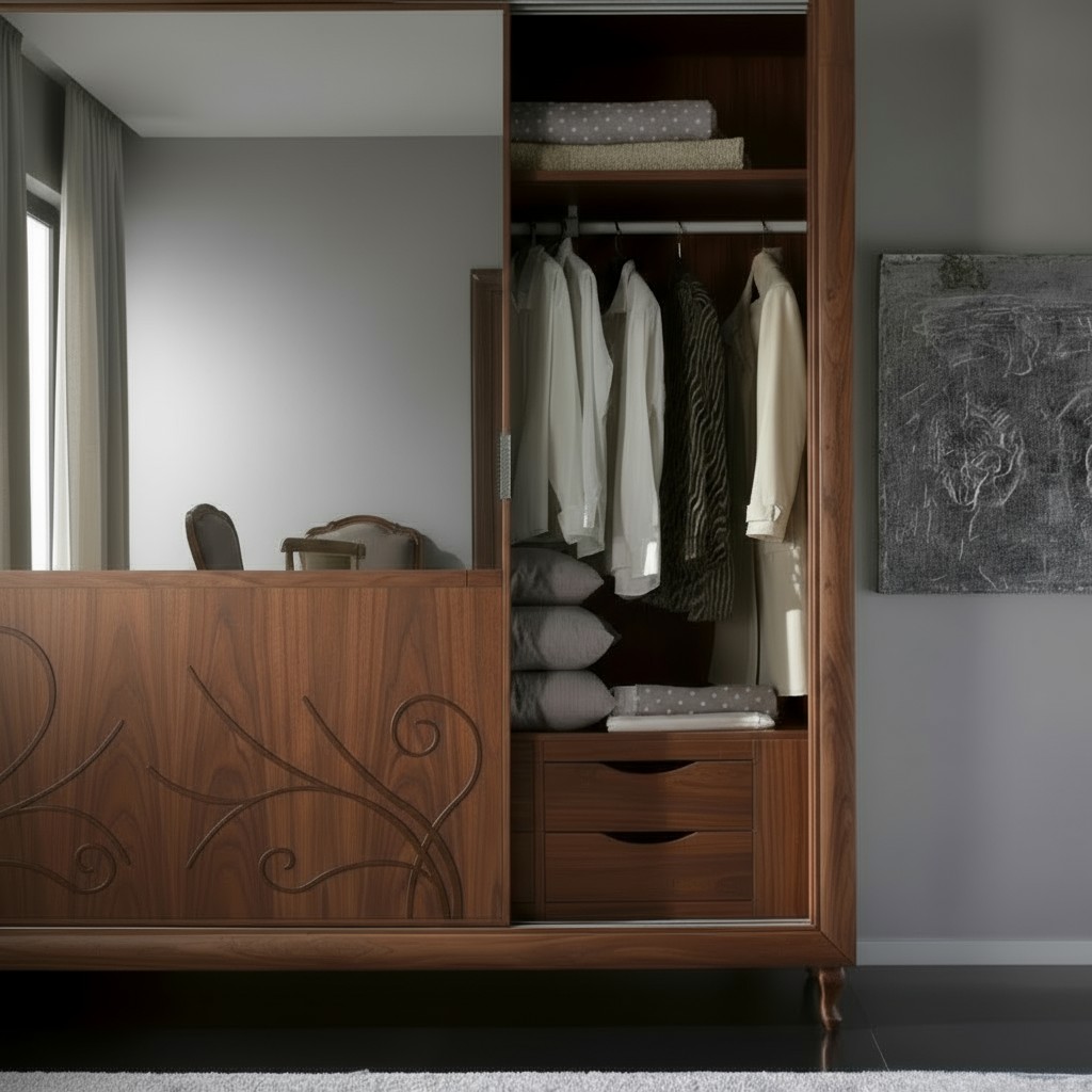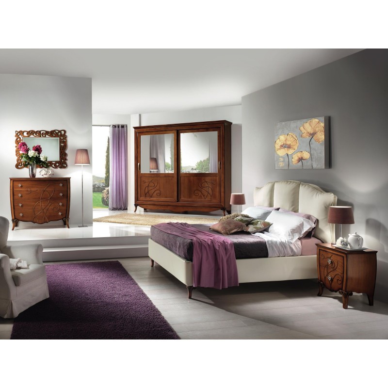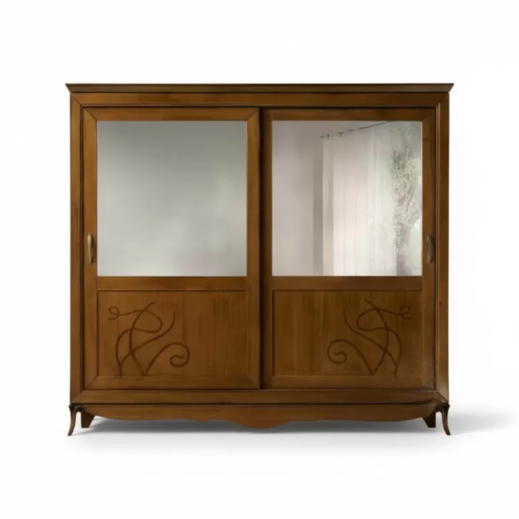 Descrizione : 2 porte scorrevoli con vetri a specchio e con lavorazione floreale in rilievo nella parte inferiore , all' interno l'armadio è dotato di 3 pali appendiabiti , 3 ripiani e una cassettiera interna con 4 cassetti .Le gambe sagomate e intagliate che proseguono in una fascia sagomata .