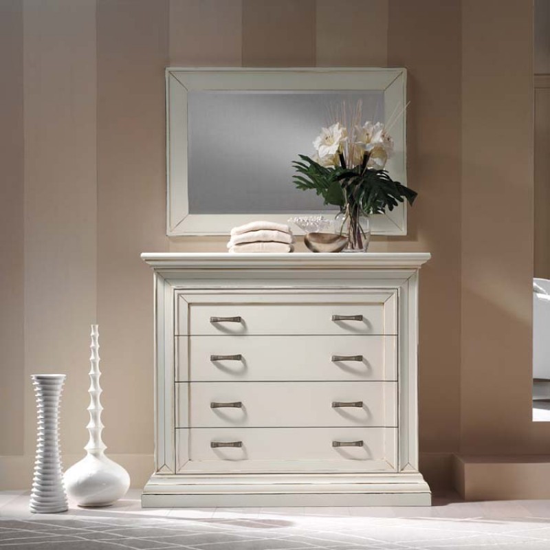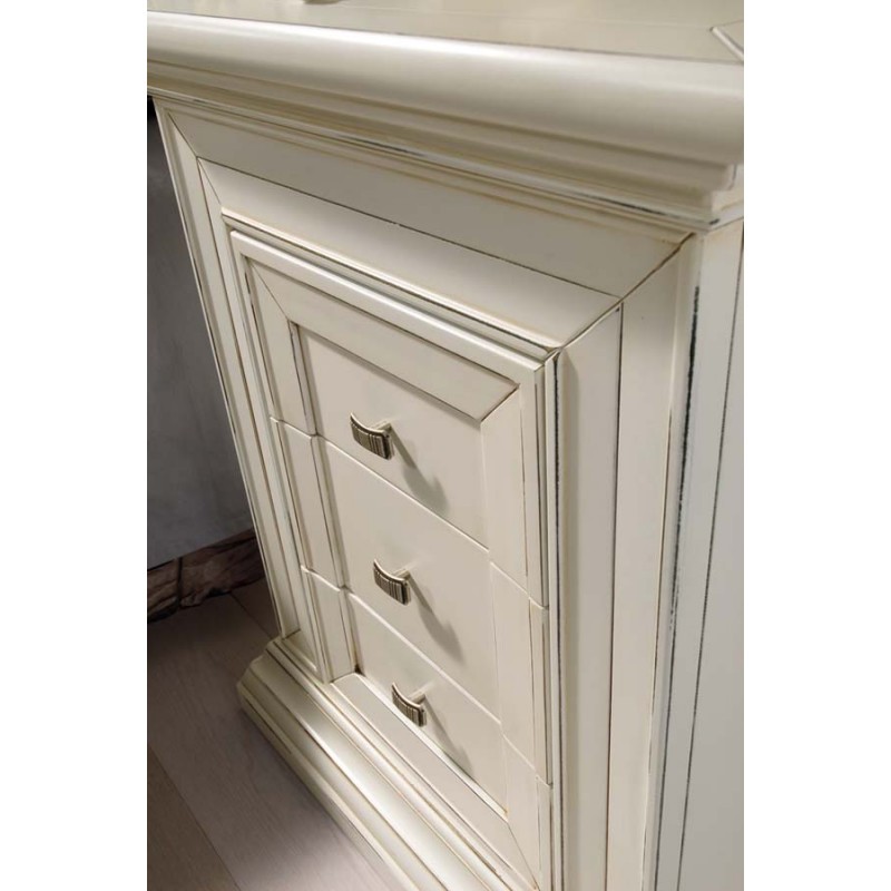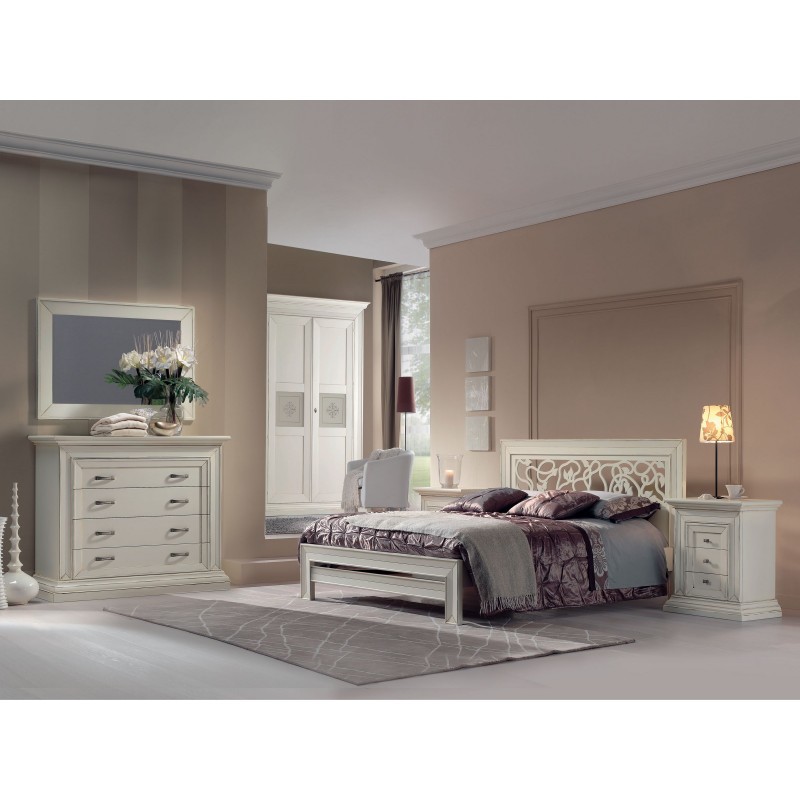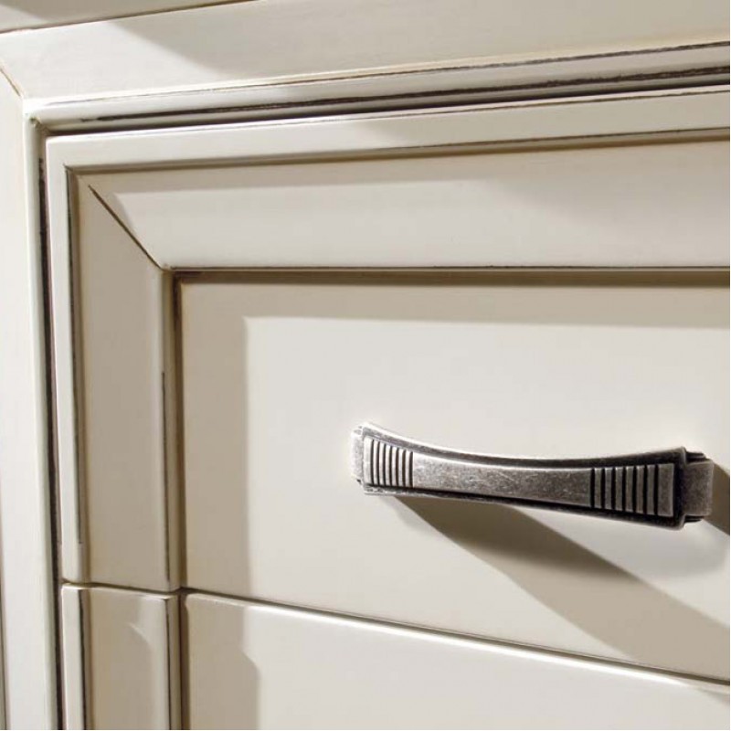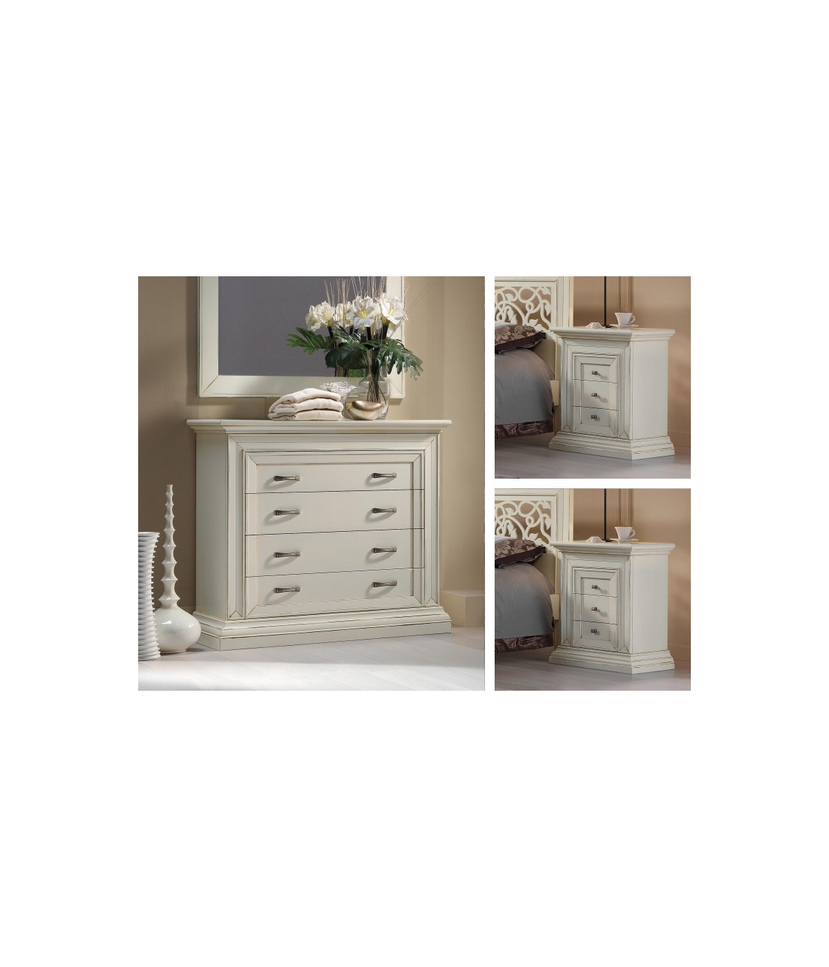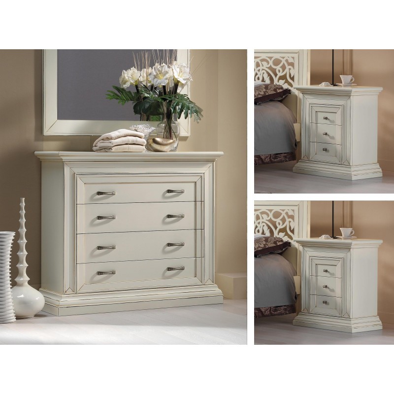 Gruppo cassettiera e Comodini costruiti in legno con struttura riquadrata, con angoli a becco di civetta e zoccolo a terra sagomato. Cassettiera e comodini dotati di cassetti per riporre all'occorrenza biancheria intima e oggetti. Trovano facilmente posto nella zona notte proteggendo con i suoi cassetti il suo contenuto all'interno. Unici nel loro genere con la sua particolare laccatura bianco anticato dando un tocco a un' atmosfera dallo stile romantico.