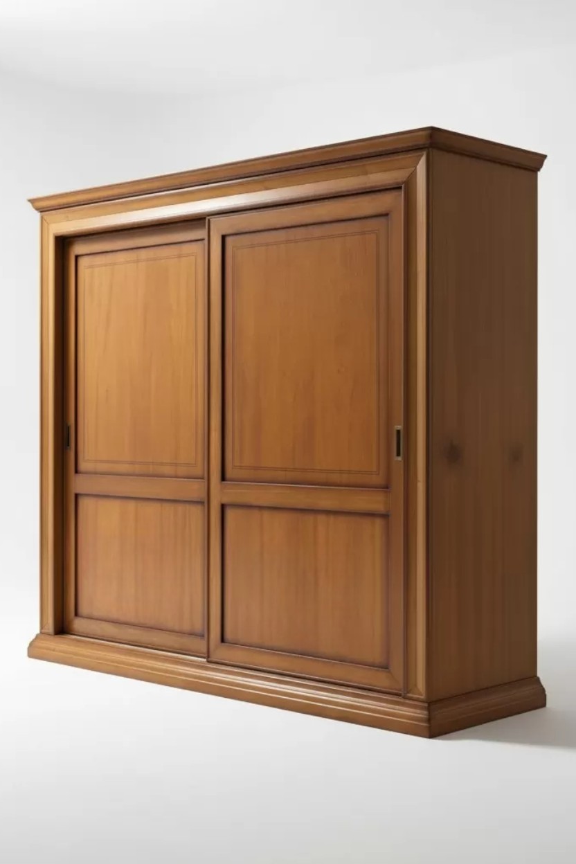 Descrizione : 2 porte scorrevoli con lavorazione a telaio , all' interno l'armadio è dotato di 3 pali appendiabiti , 3 ripiani e una cassettiera con 2 cassetti .Lo zoccolo a terra e la cornice sono rigorosamente sagomati e sporgenti dal corpo del mobile lineare .