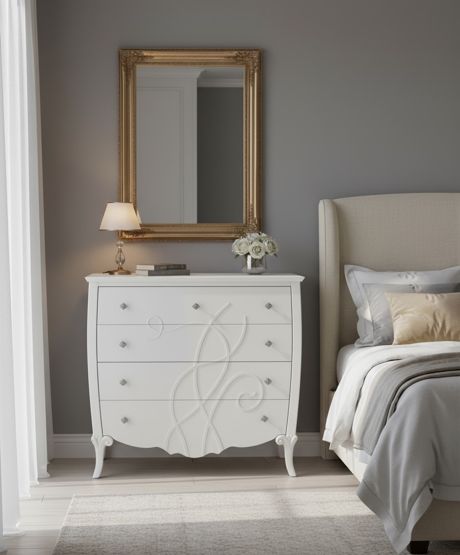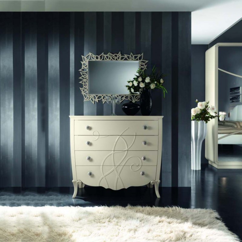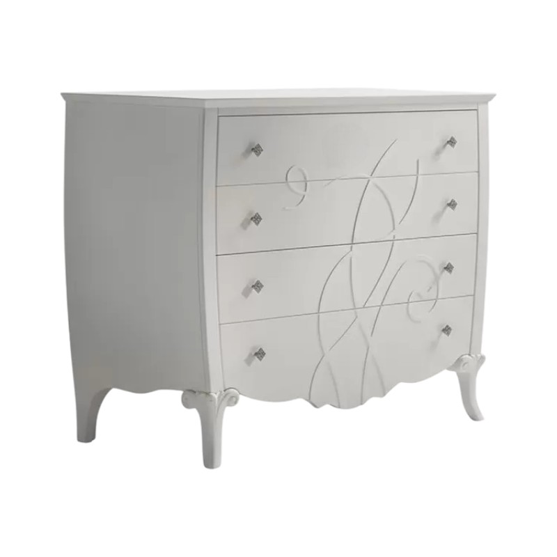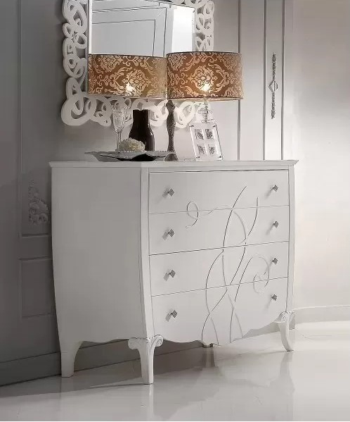 Cassettiera costruita in legno con struttura sagomata e con gambe a ricciolo. Cassettiera dotata di cassetti per riporre all'occorrenza biancheria intima e oggetti. Trovano facilmente posto nella zona notte proteggendo con i suoi cassetti il suo contenuto all'interno. Unica nel suo genere con i decori in rilievo nel frontale dei cassetti dando un tocco a un' atmosfera dallo stile romantico.