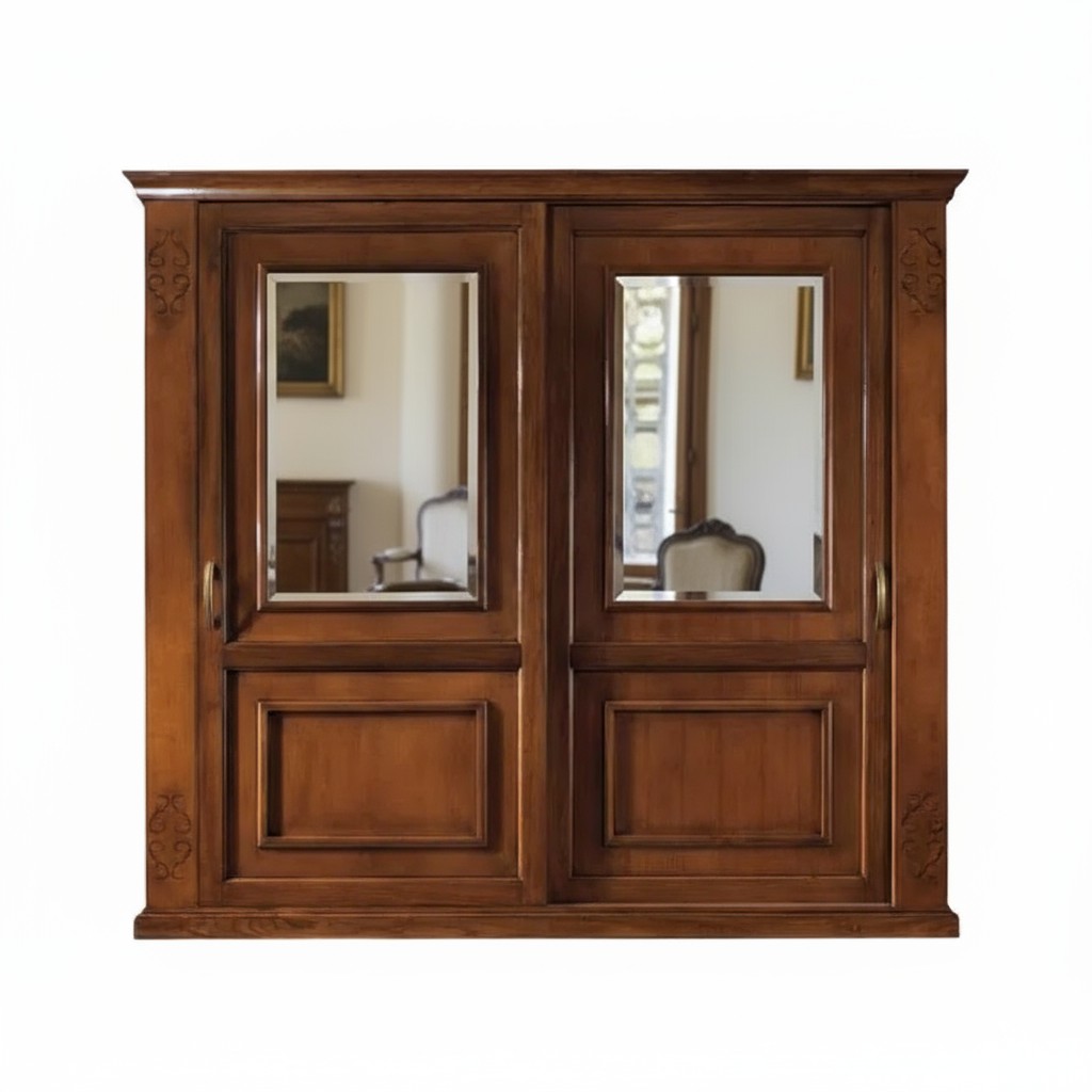 Descrizione : 2 porte scorrevoli con vetri a specchio e con incisione sulle spalle laterali nella parte superiore e inferiore, all' interno l'armadio è dotato di 3 pali appendiabiti , 3 ripiani e una cassettiera interna con 3 cassetti. Armadio con doppi riquadri nella parte inferiore e nella parte superiore dotato di vetri a specchio nelle 2 porte scorrevoli.