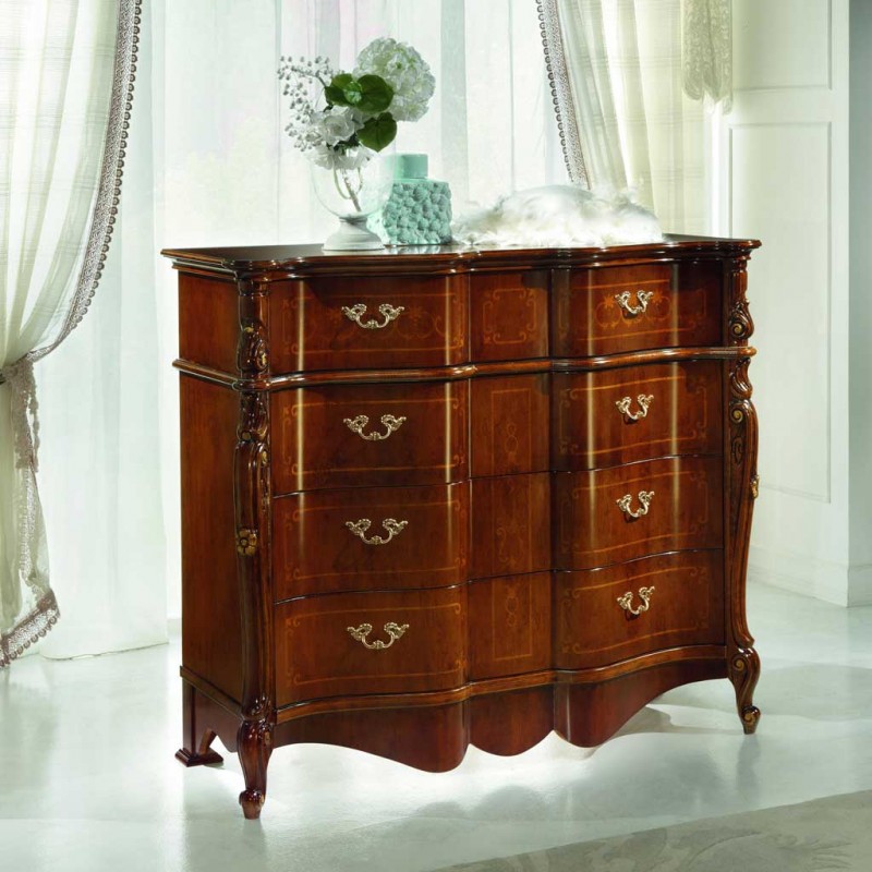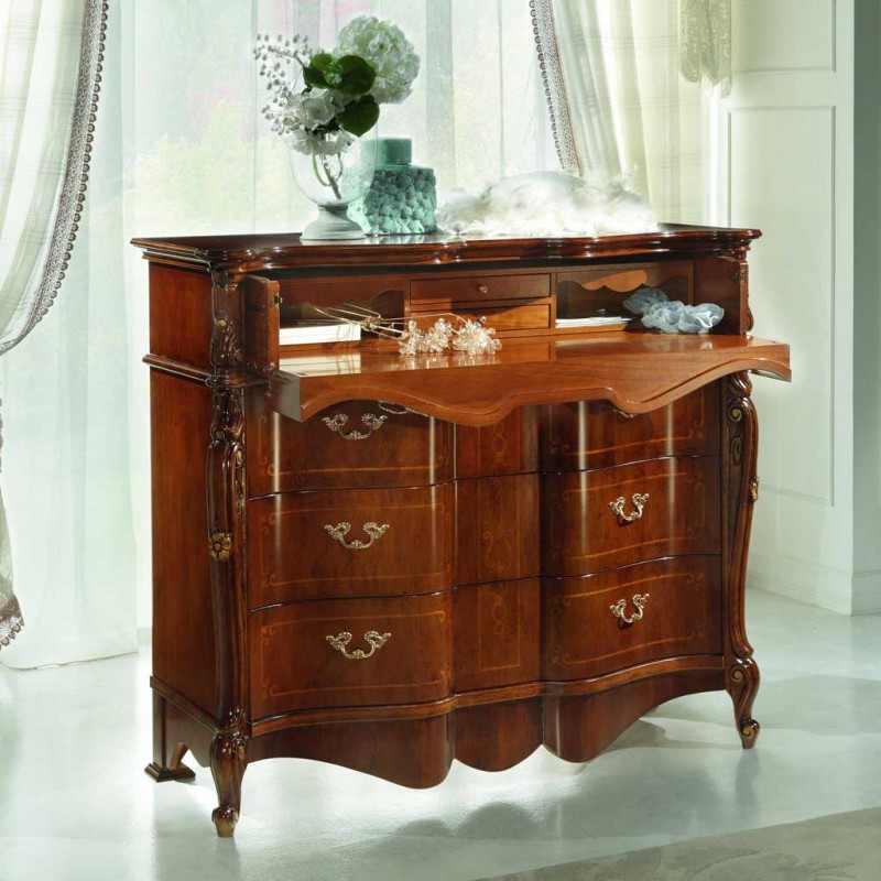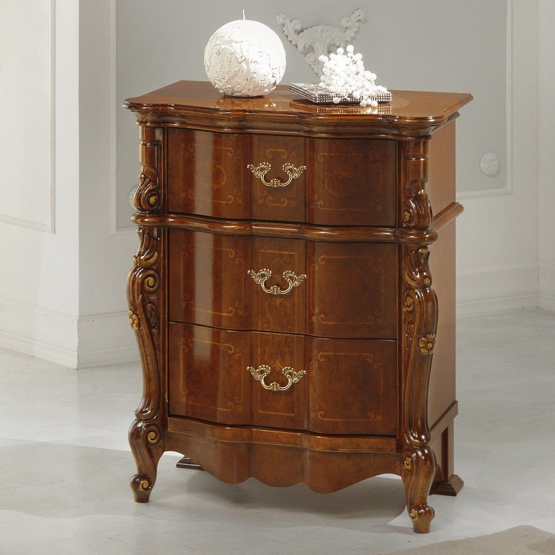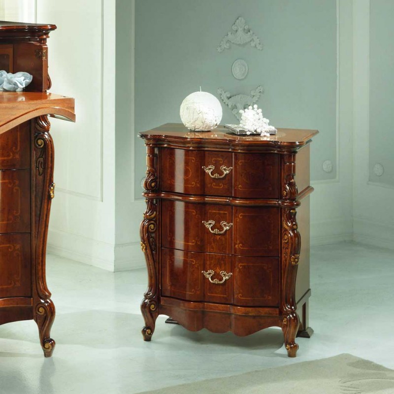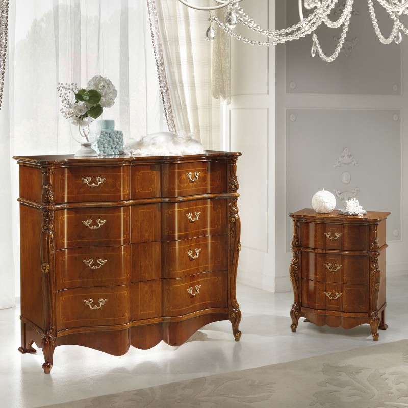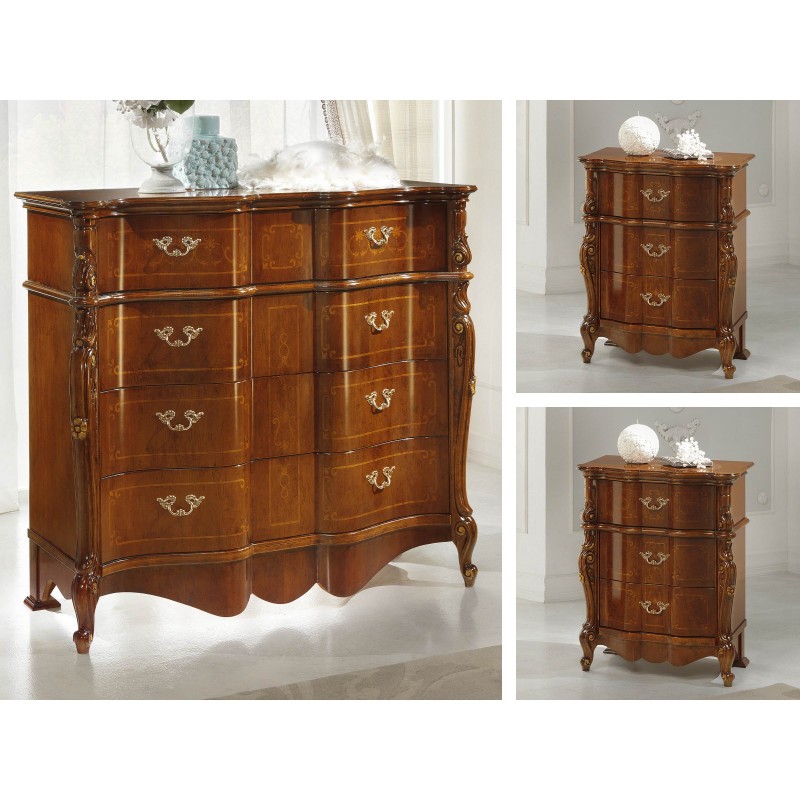 Gruppo cassettiera e Comodini costruiti in legno con fianchi e frontale dei cassetti sagomati con filettature intarsiate. Cassettiera con 3 cassetti più ribalta con all' interno il porta gioie, comodini dotati di 3 cassetti per riporre all'occorrenza biancheria intima e oggetti. Trovano facilmente posto nella zona notte proteggendo con i suoi cassetti il suo contenuto all'interno. Unici nel loro genere con la sua sagomatura dando un tocco a un' atmosfera dallo stile classico.