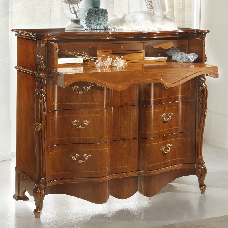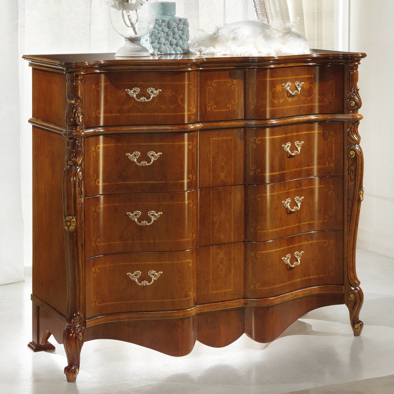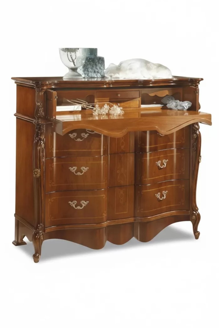 Cassettiera costruita in legno con fianchi e frontale dei cassetti sagomati con filettature intarsiate. Cassettiera dotata di cassetti per riporre all'occorrenza biancheria intima e oggetti. Trovano facilmente posto nella zona notte proteggendo con i suoi cassetti il suo contenuto all'interno. Unica nel suo genere con le sue linee sagomate dando un tocco a un' atmosfera dallo stile classico.