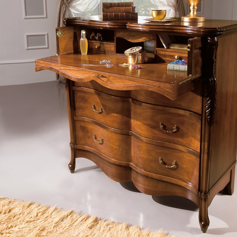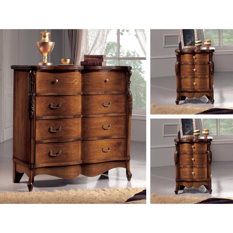 Gruppo cassettiera e Comodini costruiti in legno con fianchi e frontale dei cassetti sagomati con dettagli intarsiati. Cassettiera con 3 cassetti grandi e due cassettini piccoli più ribalta con all' interno il porta gioie, comodini dotati di 3 cassetti per riporre all'occorrenza biancheria intima e oggetti. Trovano facilmente posto nella zona notte proteggendo con i suoi cassetti il suo contenuto all'interno. Unici nel loro genere con la sua sagomatura dando un tocco a un' atmosfera dallo stile classico.