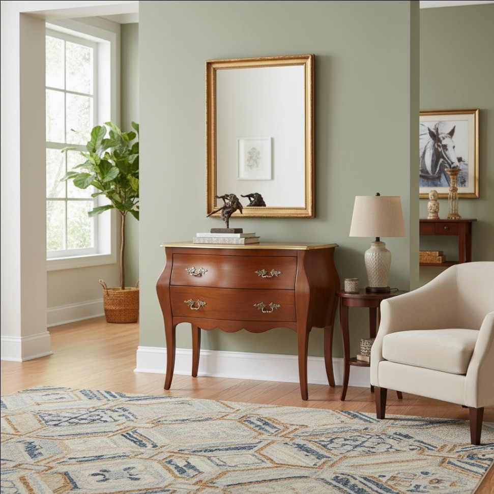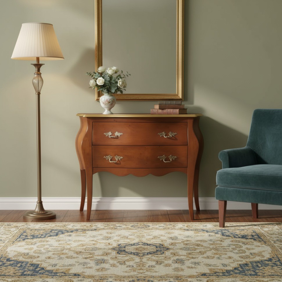 La finitura bassano si ottiene con un particolare procedimento di lavorazione che dona al comò delle striature scure sulla tinta noce
