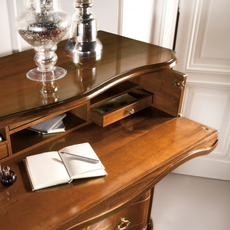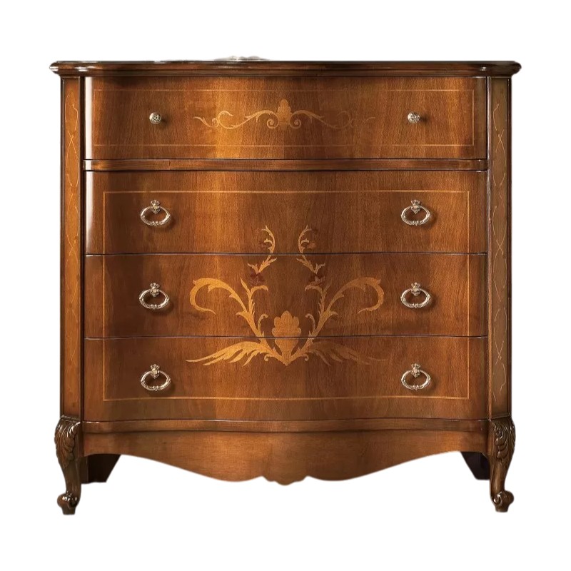 Cassettiera costruita in legno con fianchi e frontale dei cassetti sagomati con decorazioni intarsiate. Cassettiera con 3 cassetti grandi e due cassettini piccoli più ribalta con all' interno il porta gioie. Trova facilmente posto nella zona notte proteggendo con i suoi cassetti il suo contenuto all'interno. Unica nel suo genere con le sue linee sagomate dando un tocco a un' atmosfera dallo stile classico.