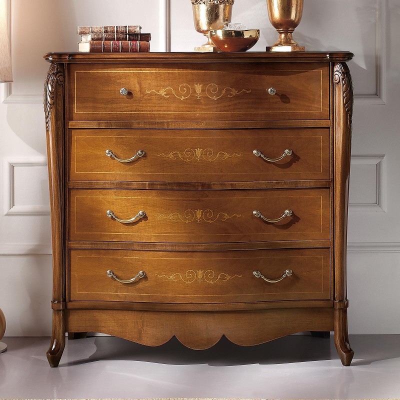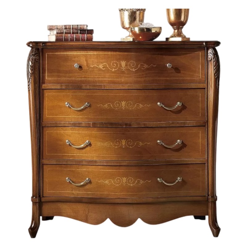 Cassettiera costruita in legno con fianchi e frontale dei cassetti sagomati con decorazioni intarsiate. Cassettiera con 3 cassetti grandi e due cassettini piccoli più ribalta con all' interno il porta gioie. Trova facilmente posto nella zona notte proteggendo con i suoi cassetti il suo contenuto all'interno. Unica nel suo genere con le sue linee sagomate dando un tocco a un' atmosfera dallo stile classico.