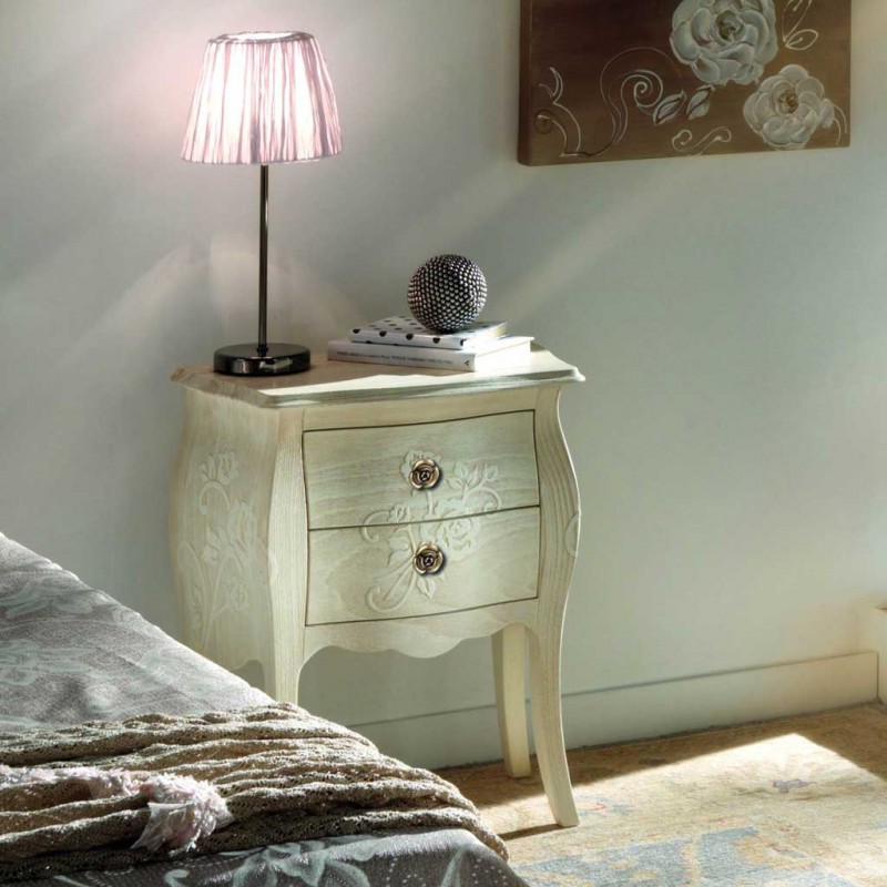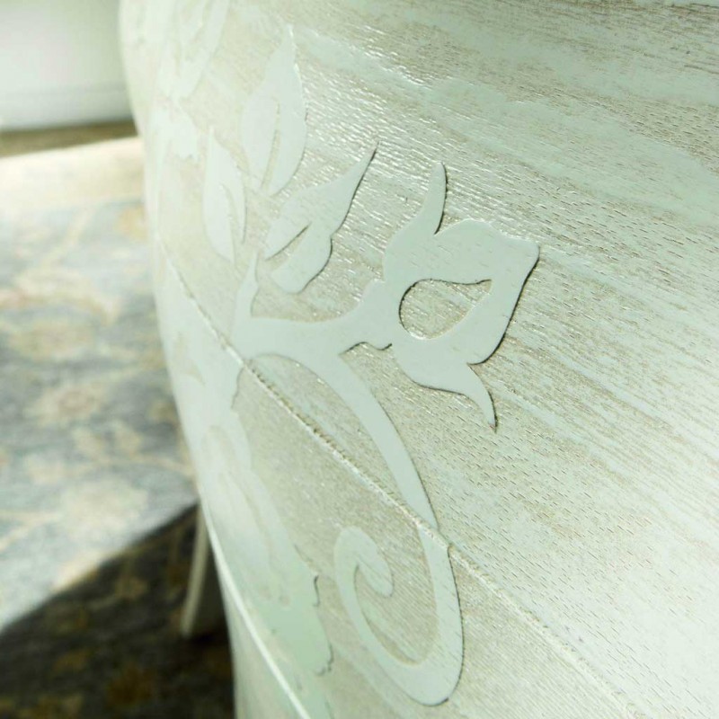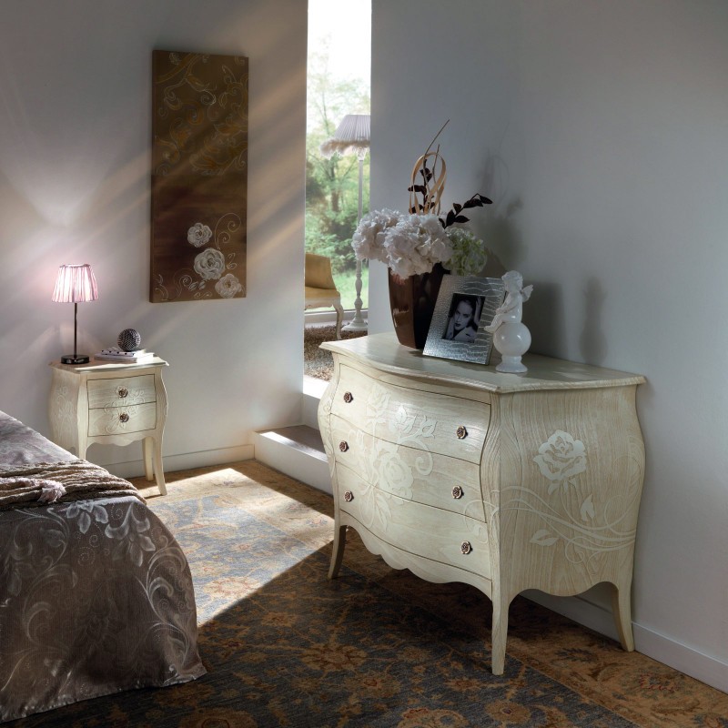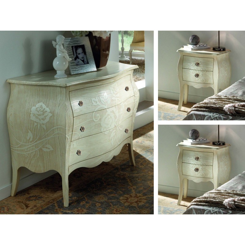 Gruppo cassettiera e Comodini costruiti in legno con struttura sagomata e decori floreali ottenuti con la sabbiatura. Cassettiera e comodini dotati di cassetti per riporre all'occorrenza biancheria intima e oggetti. Trovano facilmente posto nella zona notte proteggendo con i suoi cassetti il suo contenuto all'interno. Unici nel loro genere con la sua particolare laccatura bianco anticato dando un tocco a un' atmosfera dallo stile romantico.