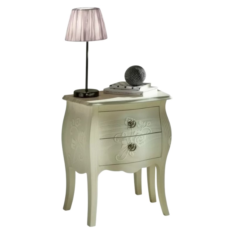 Comodino costruito in legno con struttura sagomata e decori floreali ottenuti con la sabbiatura. Comodino dotato di cassetti per riporre all'occorrenza biancheria intima e oggetti. Trovano facilmente posto nella zona notte proteggendo con i suoi cassetti il suo contenuto all'interno. Unico nel suo genere con la sua particolare laccatura bianco anticato dando un tocco a un' atmosfera dallo stile romantico.