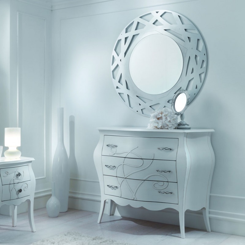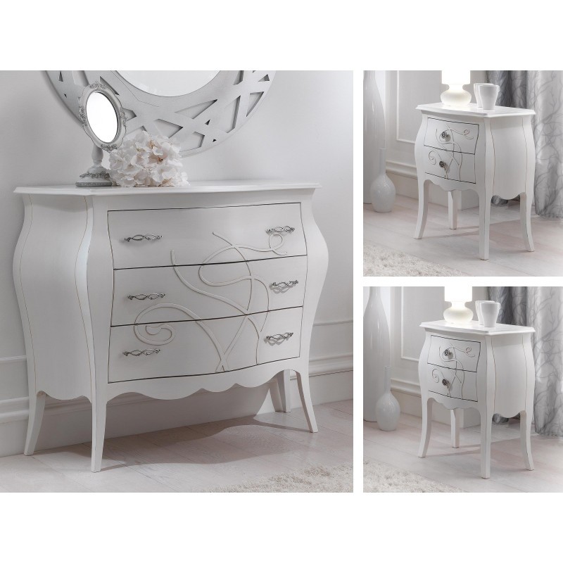 Gruppo cassettiera e Comodini costruiti in legno con struttura sagomata e decori floreali applicati in rilievo . Cassettiera e comodini dotati di cassetti per riporre all'occorrenza biancheria intima e oggetti. Trovano facilmente posto nella zona notte proteggendo con i suoi cassetti il suo contenuto all'interno. Unici nel loro genere con i suoi decori floreali applicati in rilievo dando un tocco a un' atmosfera dallo stile romantico.
