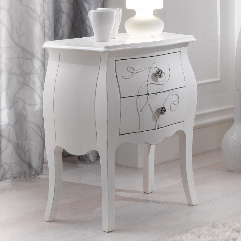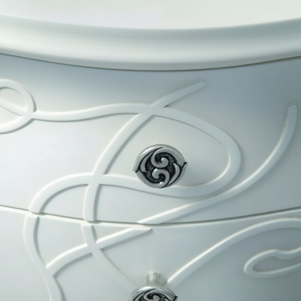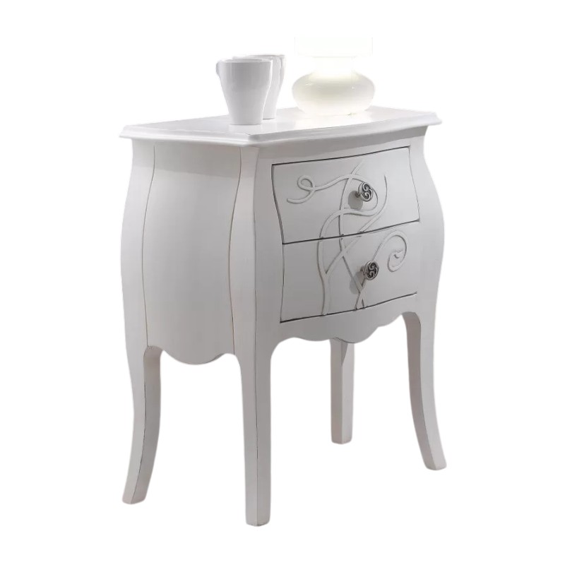 Comodino costruito in legno con struttura sagomata e decori floreali applicati in rilievo . Comodino dotato di cassetti per riporre all'occorrenza biancheria intima e oggetti. Trovano facilmente posto nella zona notte proteggendo con i suoi cassetti il suo contenuto all'interno. Unico nel suo genere con i suoi decori floreali applicati in rilievo dando un tocco a un' atmosfera dallo stile romantico.