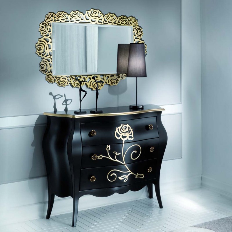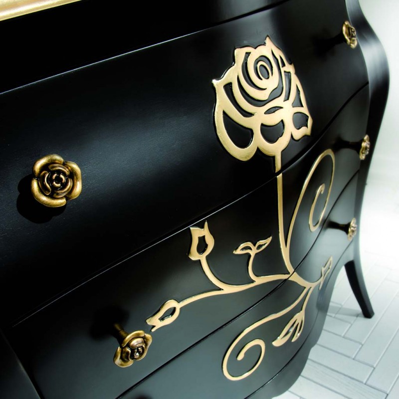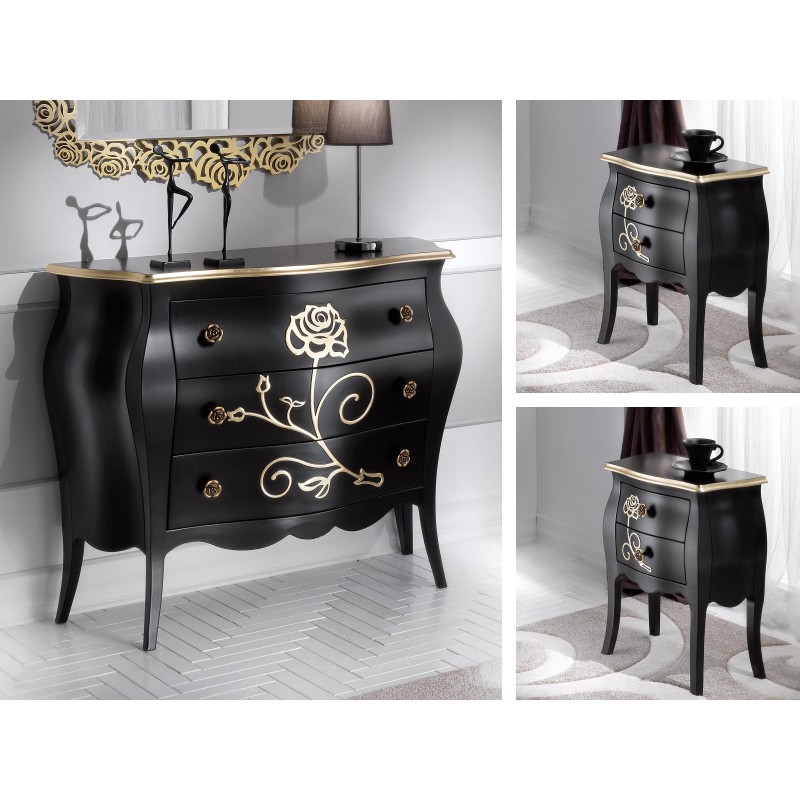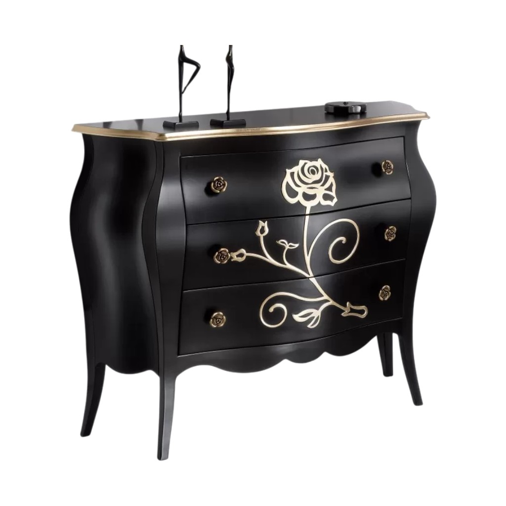 Cassettiera 3 Cassetti legno floreale nero e oro 105x42x85