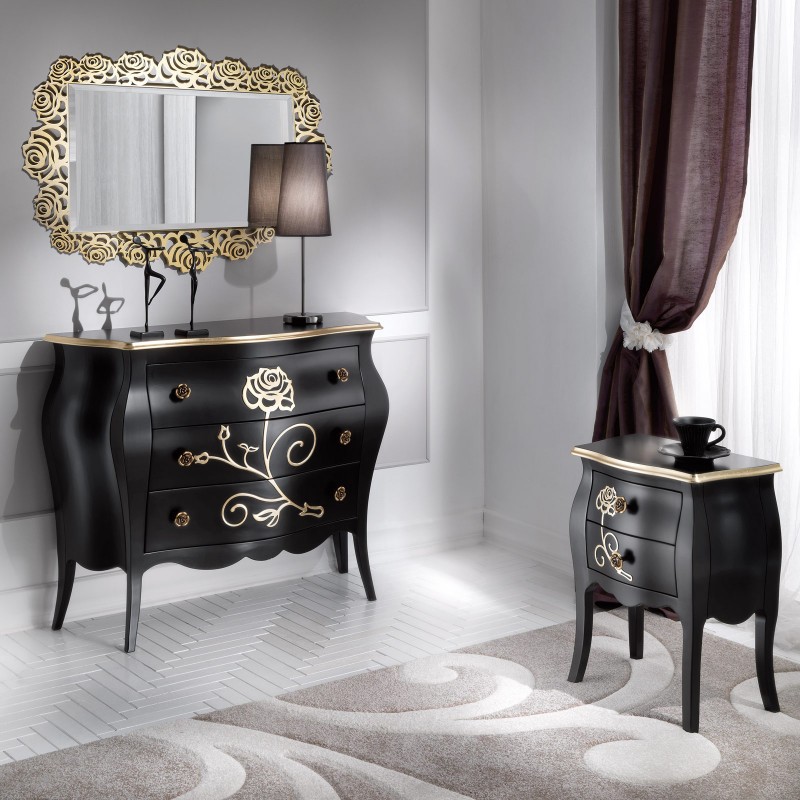 Comodino costruito in legno con struttura sagomata e decori floreali applicati in rilievo . Comodino dotato di cassetti per riporre all'occorrenza biancheria intima e oggetti. Trovano facilmente posto nella zona notte proteggendo con i suoi cassetti il suo contenuto all'interno. Unico nel suo genere con i suoi decori floreali applicati in rilievo dando un tocco a un' atmosfera dallo stile romantico.