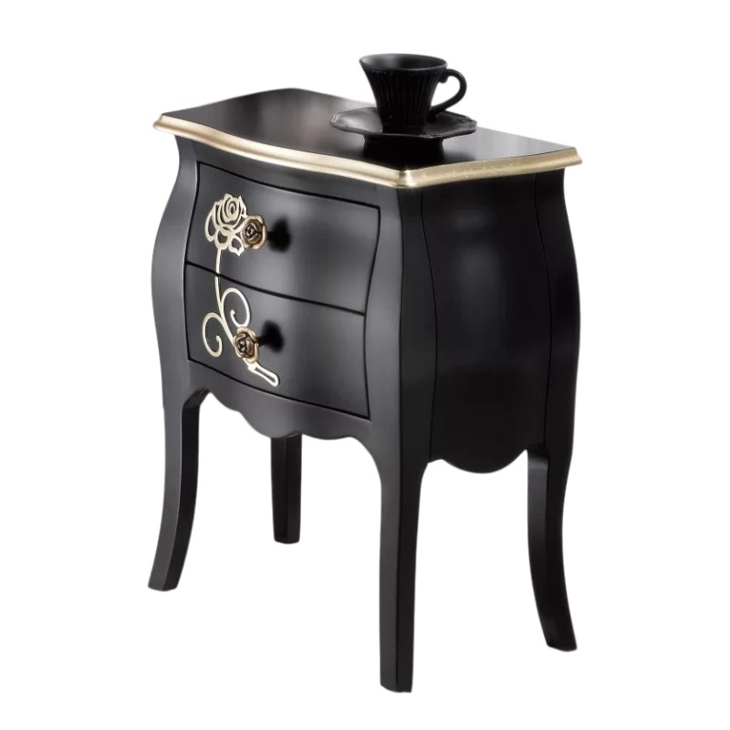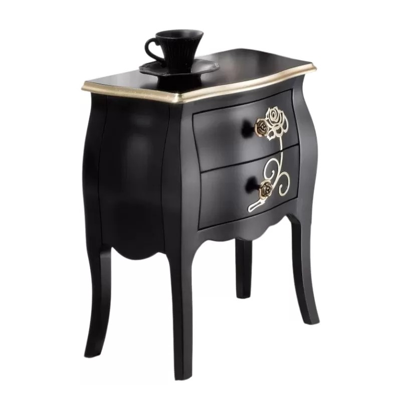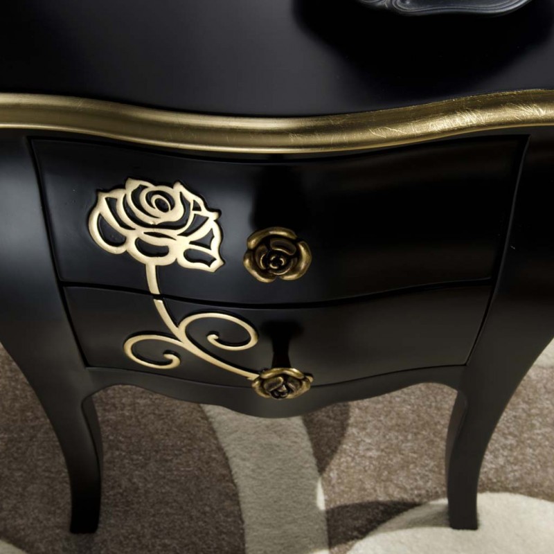 Comodino 2 cassetti shabby legno floreale nero e oro 50x30x60