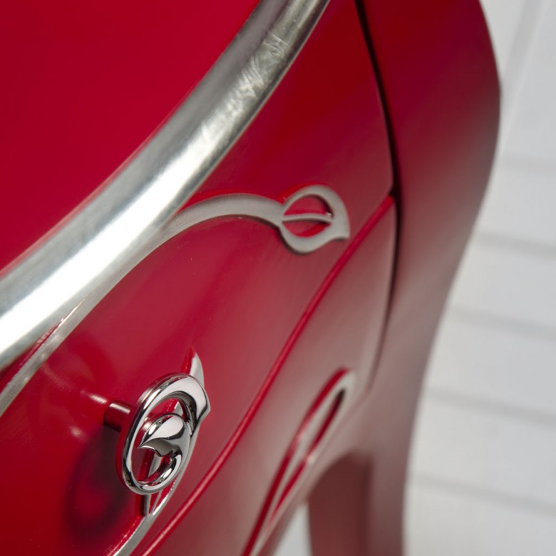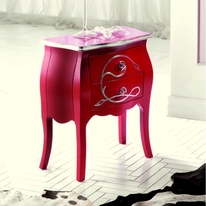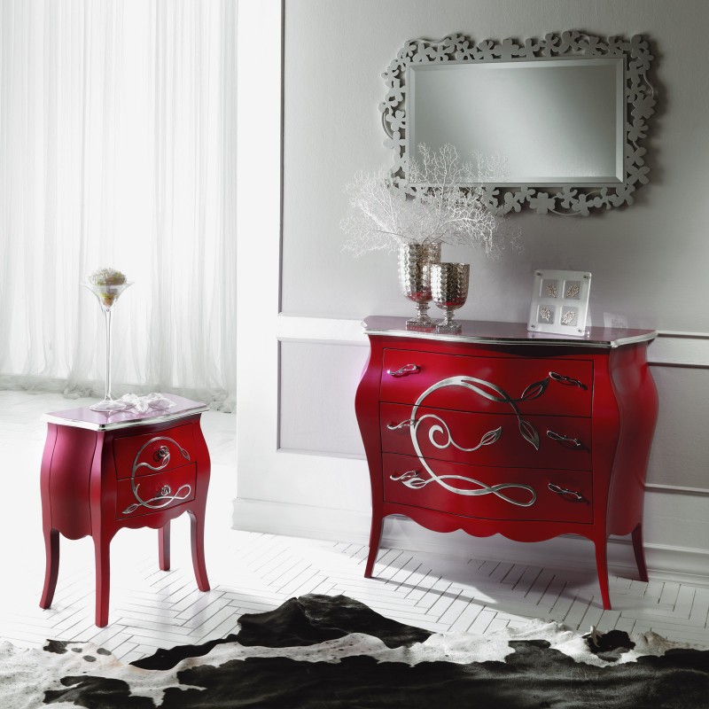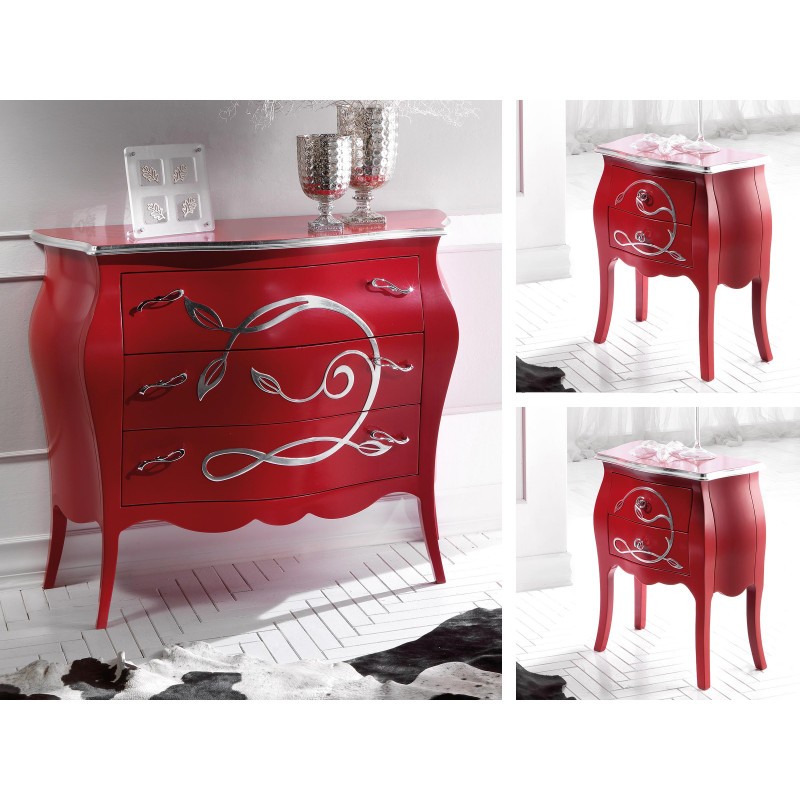 Gruppo 1 Cassettiera 2 Comodini legno floreale rosso e argento