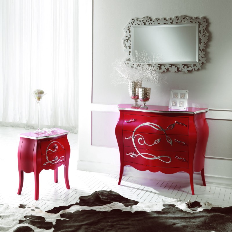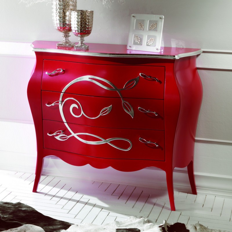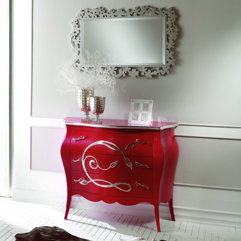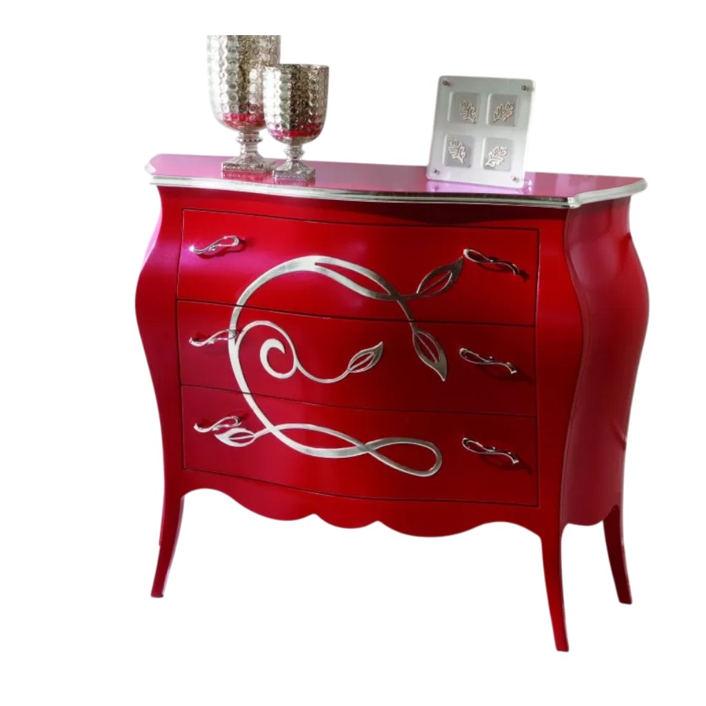 Cassettiera 3 Cassetti legno floreale rosso e argento 105x42x85