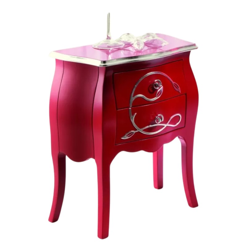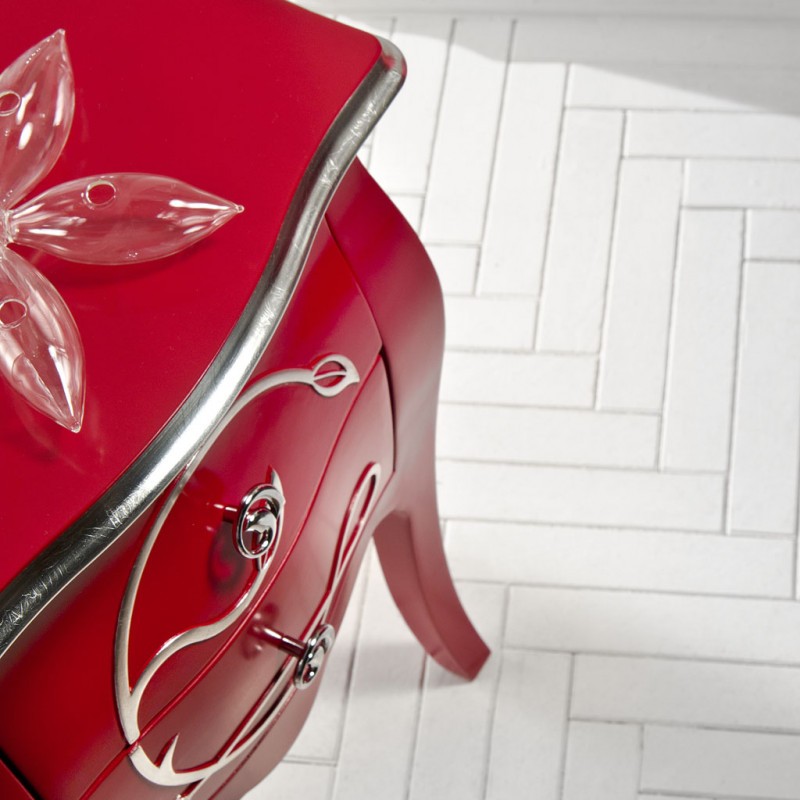 Comodino costruito in legno con struttura sagomata e decori floreali applicati in rilievo . Comodino dotato di cassetti per riporre all'occorrenza biancheria intima e oggetti. Trovano facilmente posto nella zona notte proteggendo con i suoi cassetti il suo contenuto all'interno. Unico nel suo genere con i suoi decori floreali applicati in rilievo dando un tocco a un' atmosfera dallo stile romantico.