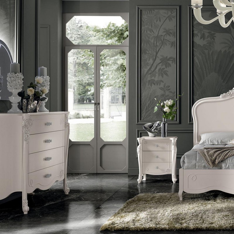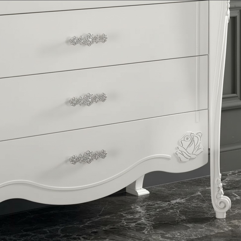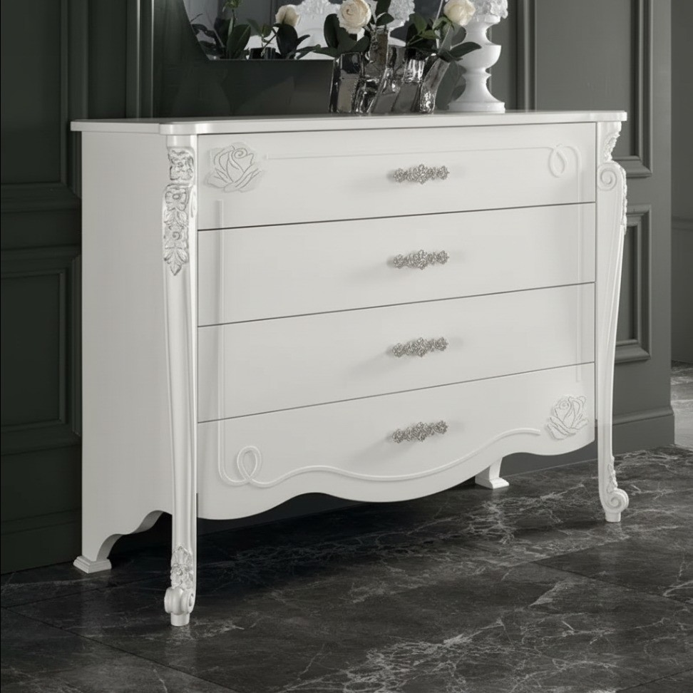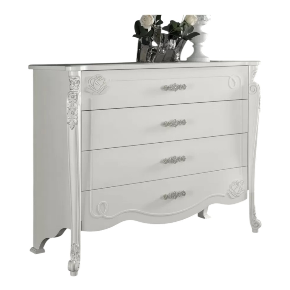 Cassettiera costruita in legno con fianchi e struttura intagliata, con angoli stondati e decorazioni floreali sui frontale dei cassetti. Cassettiera dotata di cassetti per riporre all'occorrenza biancheria intima e oggetti. Trovano facilmente posto nella zona notte proteggendo con i suoi cassetti il suo contenuto all'interno. Unica nel suo genere con i suoi particolari decori floreali in rilievo dando un tocco a un' atmosfera dallo stile romantico.