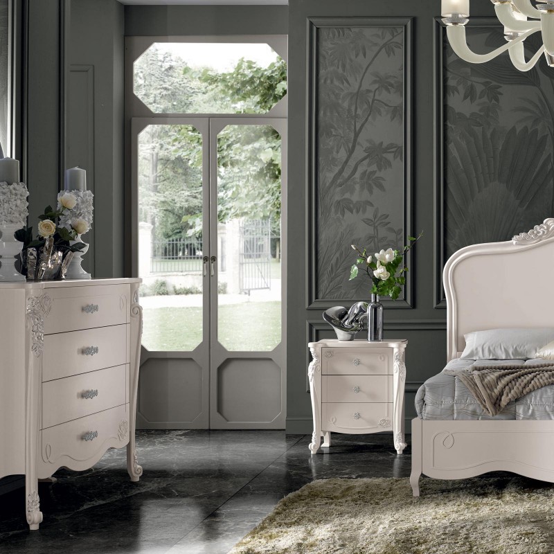 Comodino costruito in legno con fianchi e struttura intagliata, con angoli stondati e decorazioni floreali sui frontale dei cassetti. Comodino dotato di cassetti per riporre all'occorrenza biancheria intima e oggetti. Trovano facilmente posto nella zona notte proteggendo con i suoi cassetti il suo contenuto all'interno. Unico nel suo genere con i suoi particolari decori floreali in rilievo dando un tocco a un' atmosfera dallo stile romantico.
