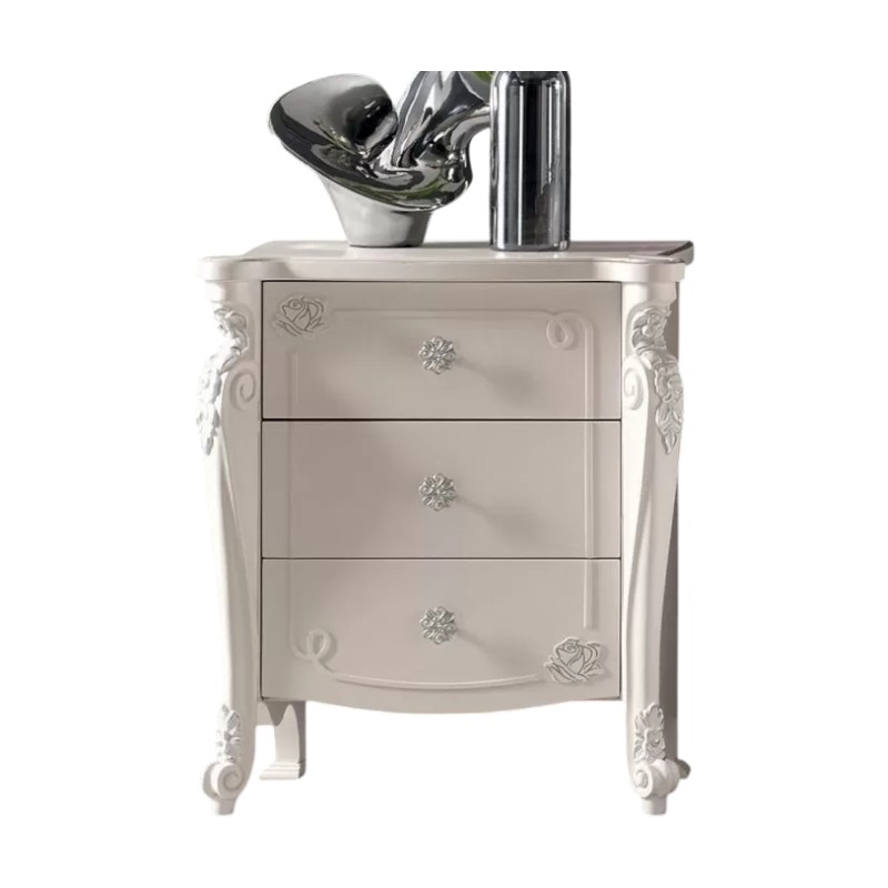 Comodino 3 cassetti legno bianco decori intagliati 62x43x69