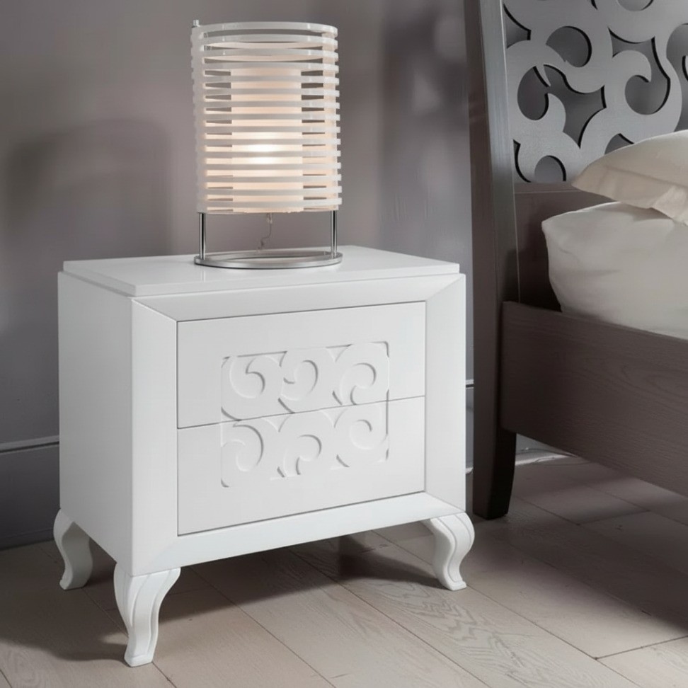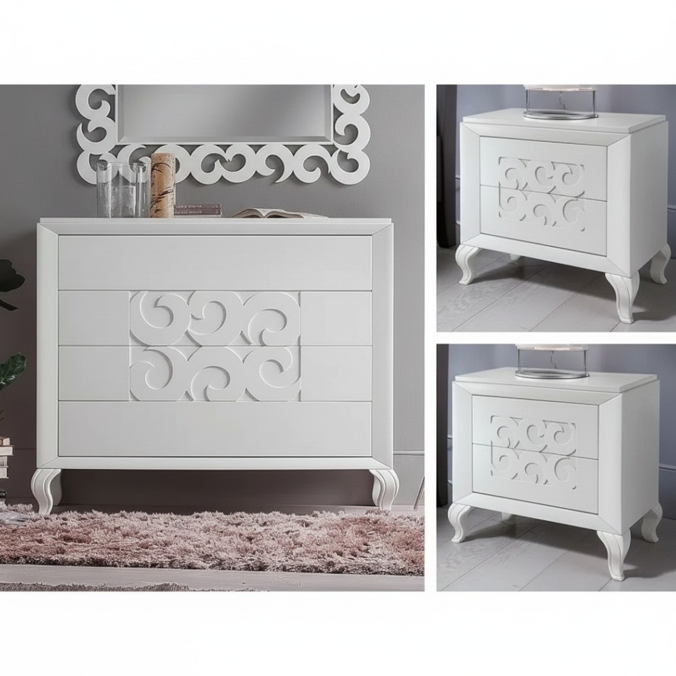 Gruppo cassettiera e Comodini costruiti in legno con fianchi e struttura intagliata e decorazioni in rilievo sui frontale dei cassetti. Cassettiera e comodini dotati di cassetti per riporre all'occorrenza biancheria intima e oggetti. Trovano facilmente posto nella zona notte proteggendo con i suoi cassetti il suo contenuto all'interno. Unici nel loro genere con i suoi particolari intagli in rilievo dando un tocco a un' atmosfera dallo stile contemporaneo.