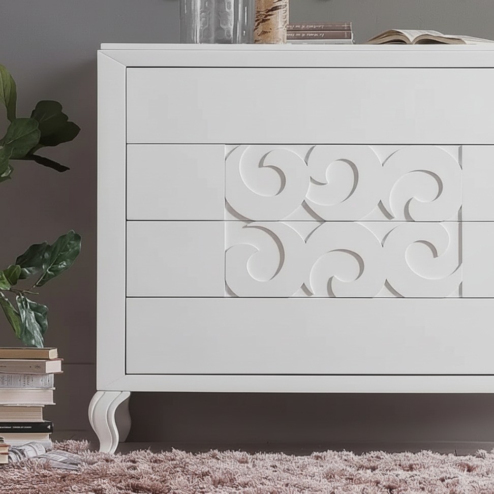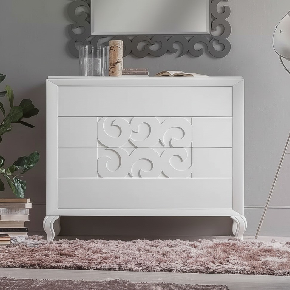 4 cassetti con decori intagliati in rilievo