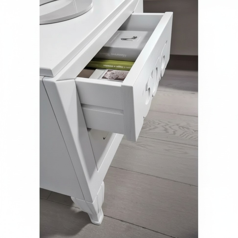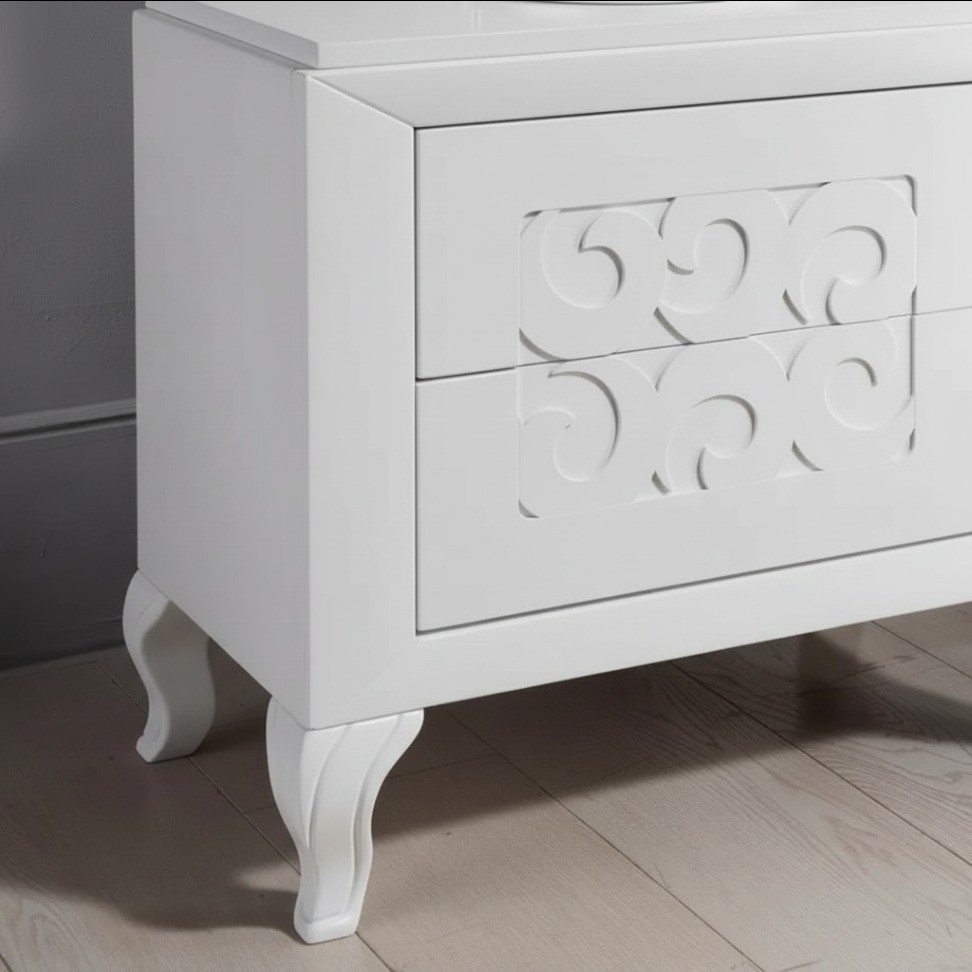 Gruppo 1 Cassettiera 2 Comodini legno frassino bianco decori intagliati