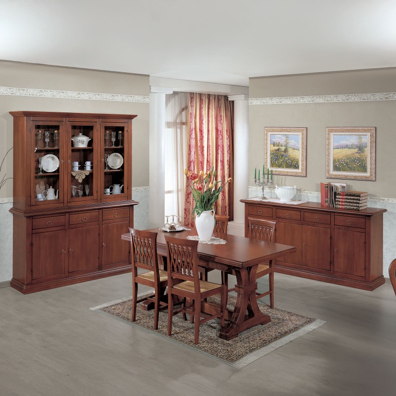 Soggiorno dalle linee semplici e pulite costruito in legno che lascerà a bocca aperta gli ospiti. Progettato per riunire eleganza e praticità arredando in un' unica composizione il salotto. Trovano facilmente posto nella zona giorno grazie ai suoi ripiani per esporre oggetti in vetro e da collezione , i suoi cassetti per inserire strofinacci e posate e ai suoi spazi interni per inserire pentole e accessori per la cucina, accompagnato da un tavolo da pranzo e 6 sedie creando il tuo soggiorno ideale per accogliere amici e parenti.