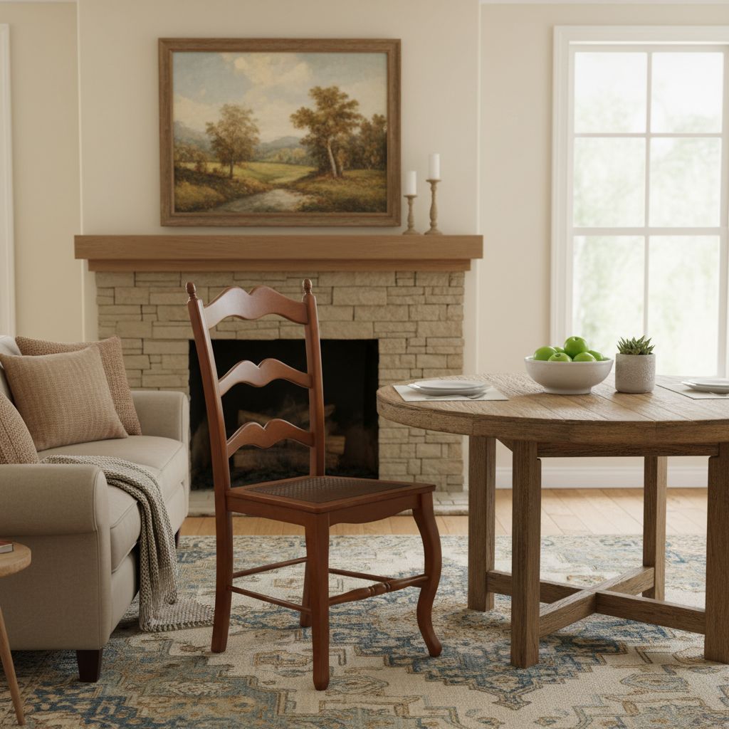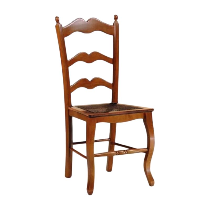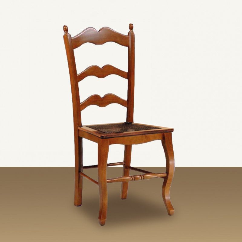 Sedia in stile country con spalliera sagomata e decorazione pigna sui terminali della spalliera.