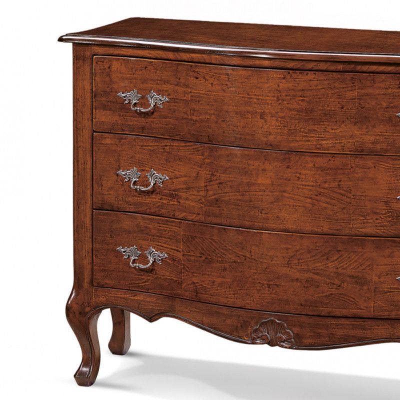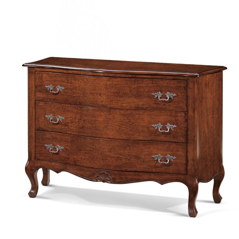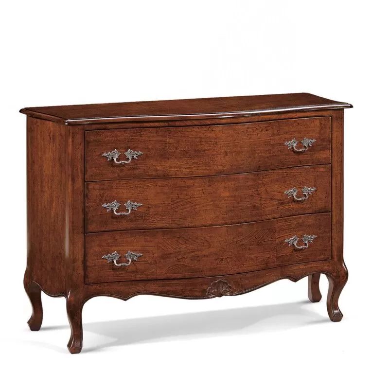 Cassettiera sagomata costruita in legno con gambe a sciabola. Cassettiera dotata di tre cassetti per riporre all'occorrenza biancheria intima e oggetti. Trovano facilmente posto nella zona notte proteggendo con i suoi cassetti il suo contenuto all'interno. Unica nel suo genere con il suo particolare intaglio dando un tocco a un' atmosfera dallo stile unico e originale .