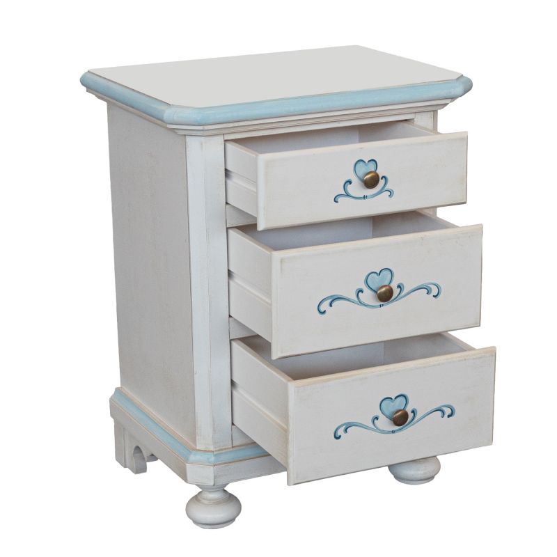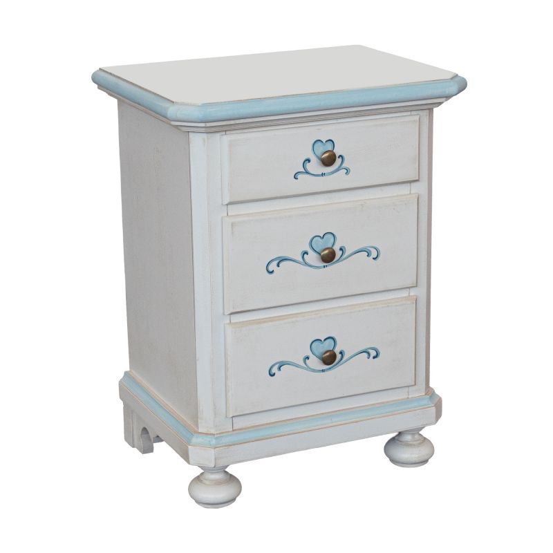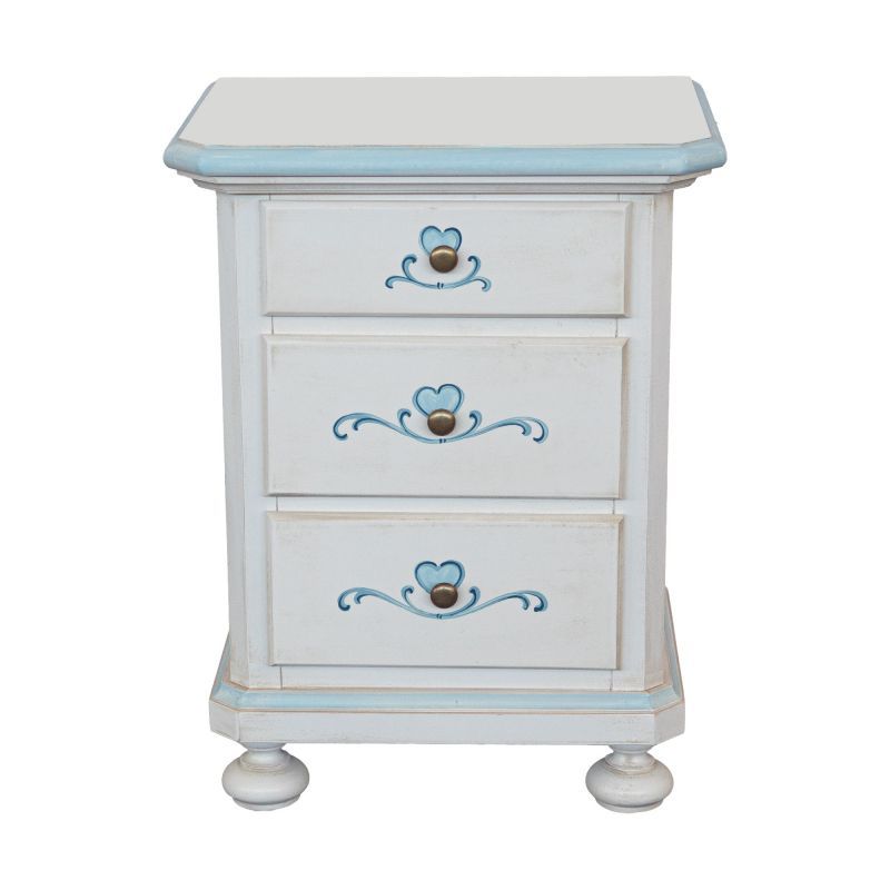 Comodino in stile shabby costruito in legno rendendo il mobile solido e allo stesso tempo elegante. Dotato di 3 cassetti con gambe a cipolla. Ideale per la zona giorno, per l'entrata per riporre il telefono o come comodino per la zona notte. Unica nel suo genere con i suoi decori a forma di cuore dando un tocco a un' atmosfera dallo stile d'altri tempi .