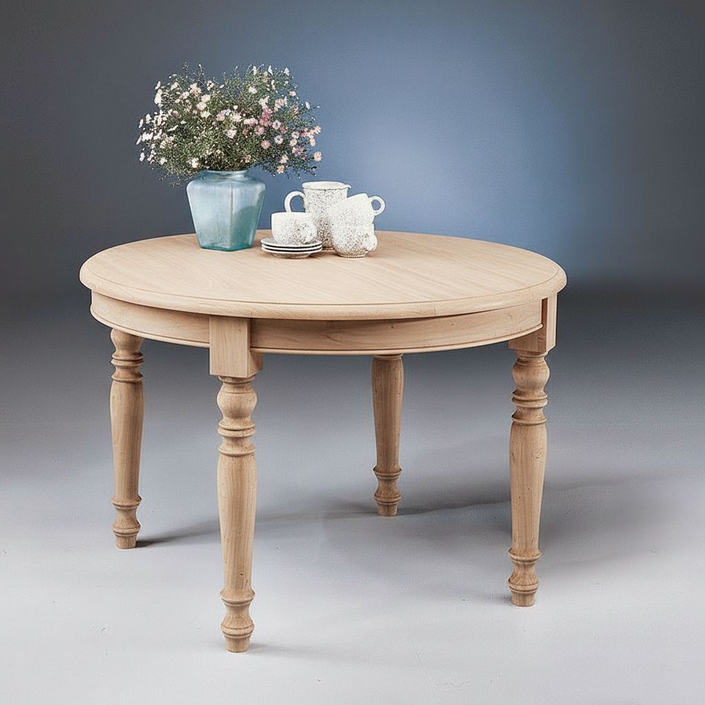 tavolo tondo con 4 gambe sagomate, diametro 120 cm con 1 allunga da 40 cm