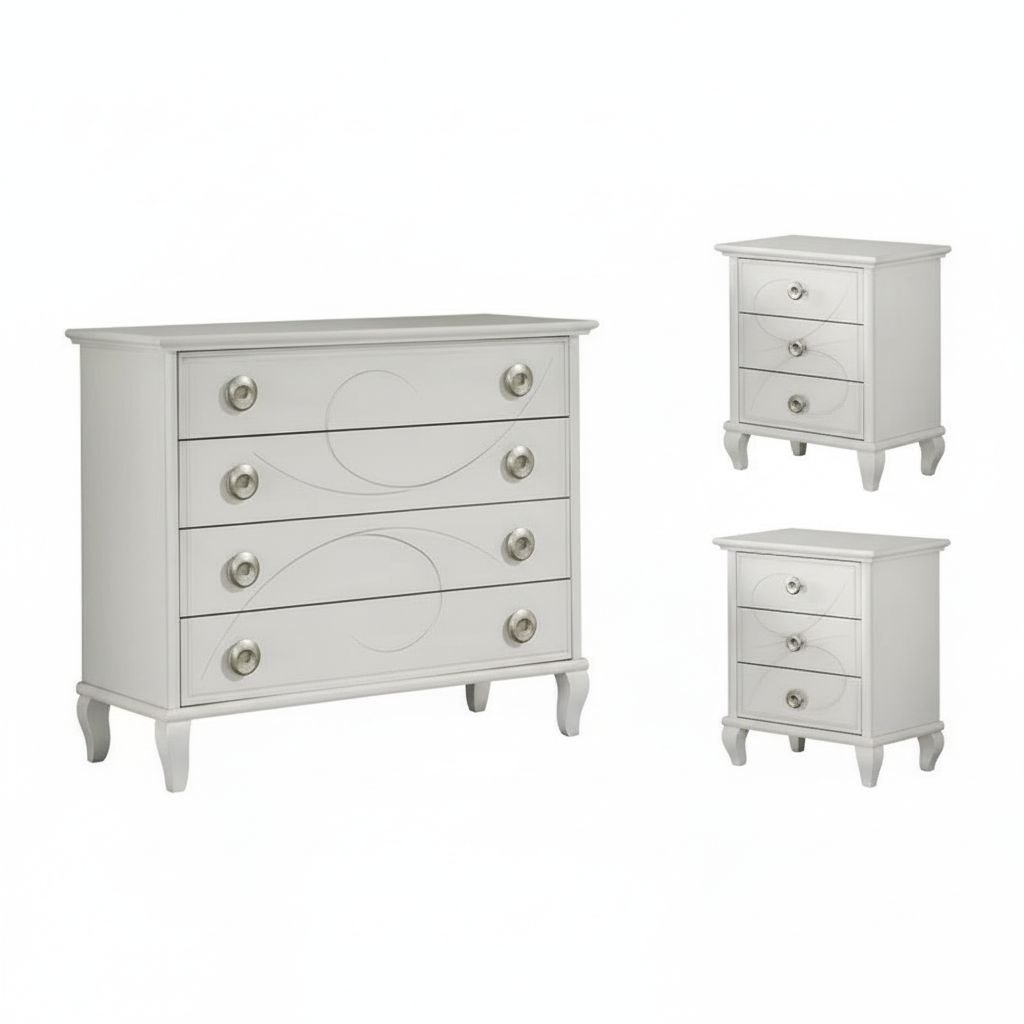 Gruppo cassettiera e Comodini costruiti in legno con angoli a becco di civetta e gambe a sciabola. Cassettiera e comodini dotati di cassetti per riporre all'occorrenza biancheria intima e oggetti. Trovano facilmente posto nella zona notte proteggendo con i suoi cassetti il suo contenuto all'interno. Unici nel loro genere con la sue particolari incisioni sui frontali dei cassetti e le sue linee classiche dando un tocco a un' atmosfera dallo stile d'altri tempi.