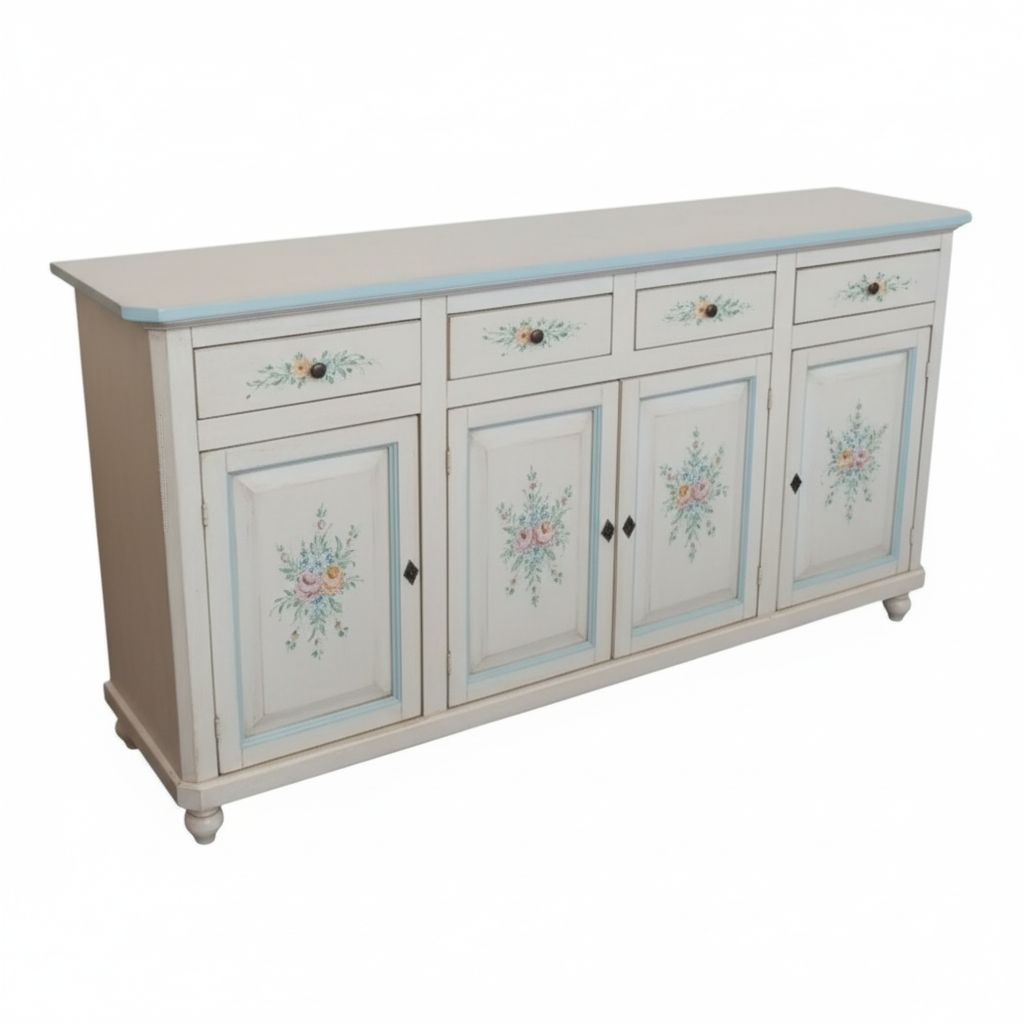 Madia credenza 4 porte legno bianco invecchiato decori azzurri 196X43X98