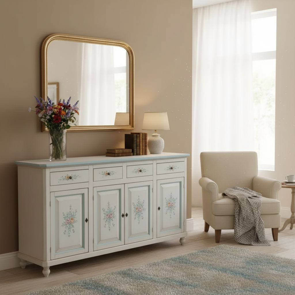 Madia in stile shabby che ti permetterà di riporre i tuoi servizi da tavola. Dotata di 4 cassetti e 4 porte con un ripiano fisso all'interno. Solida e robusta ma allo stesso tempo la rende funzionale sfruttando i cassetti e il ripiano interno. Ideale per la zona del salotto o come mobile per l'entrata ottimizzando gli spazi.