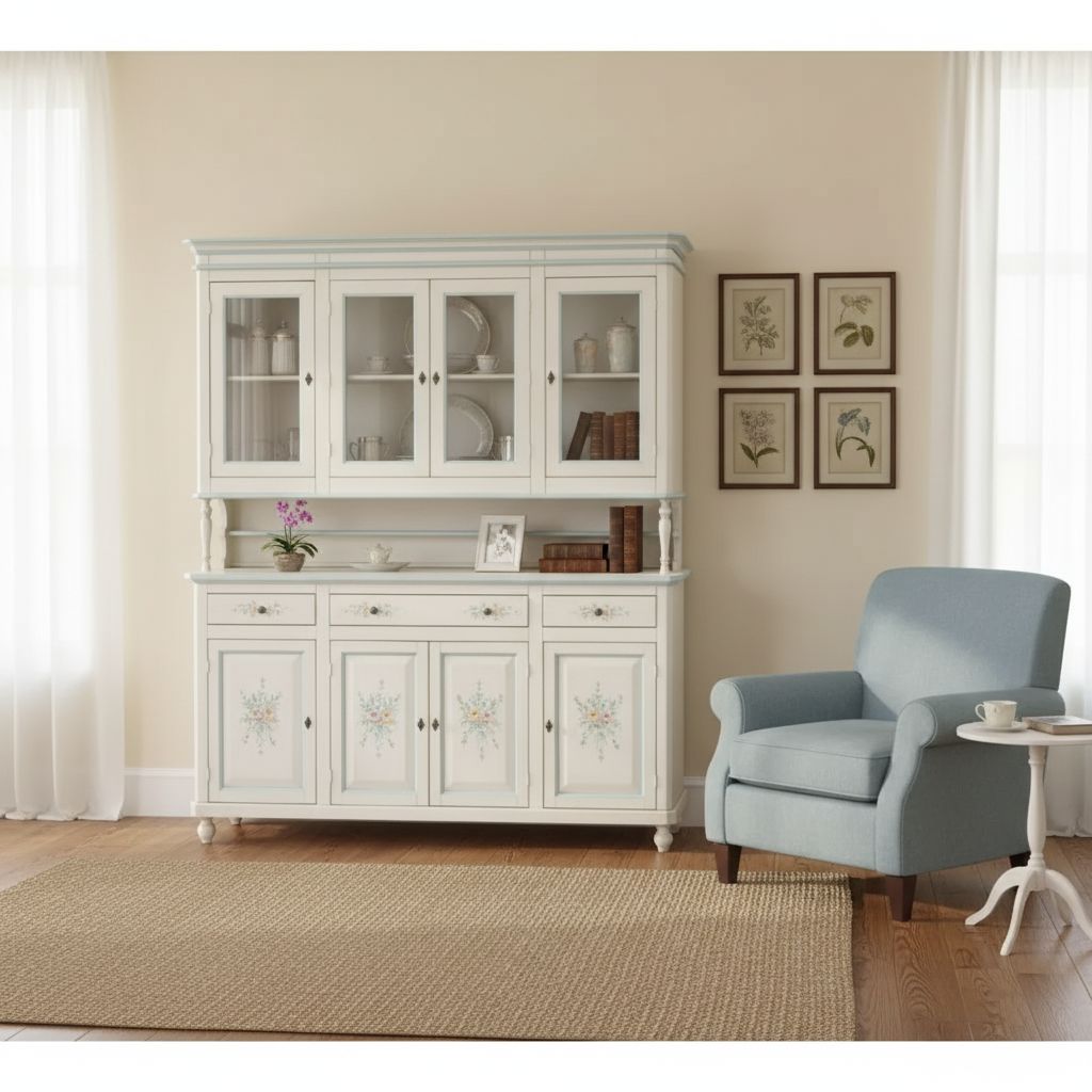 Cristalliera in stile shabby elegante e con proporzioni perfette per qualsiasi stanza, adatta per contenere al suo interno stoviglie : bicchieri , piatti , tazze e servizi da the o caffè risaltando tutto quanto esposto sui ripiani. Elemento d' arredo adatto per salotti e nelle cucine, esteticamente appagante e allo stesso tempo funzionale e spazioso.