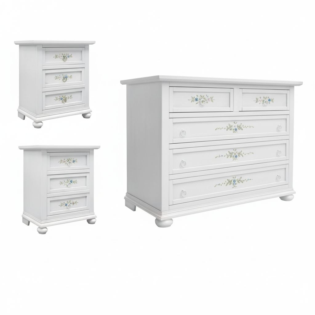 Gruppo comò e 2 comodini unici nel suo genere ! Questo gruppo di comò e comodini offriranno un gusto shabby alla tua stanza ,pratico e funzionale per il riordino dei vari indumenti e allo stesso tempo trasmettono maestria nella decorazione d'altri tempi. .