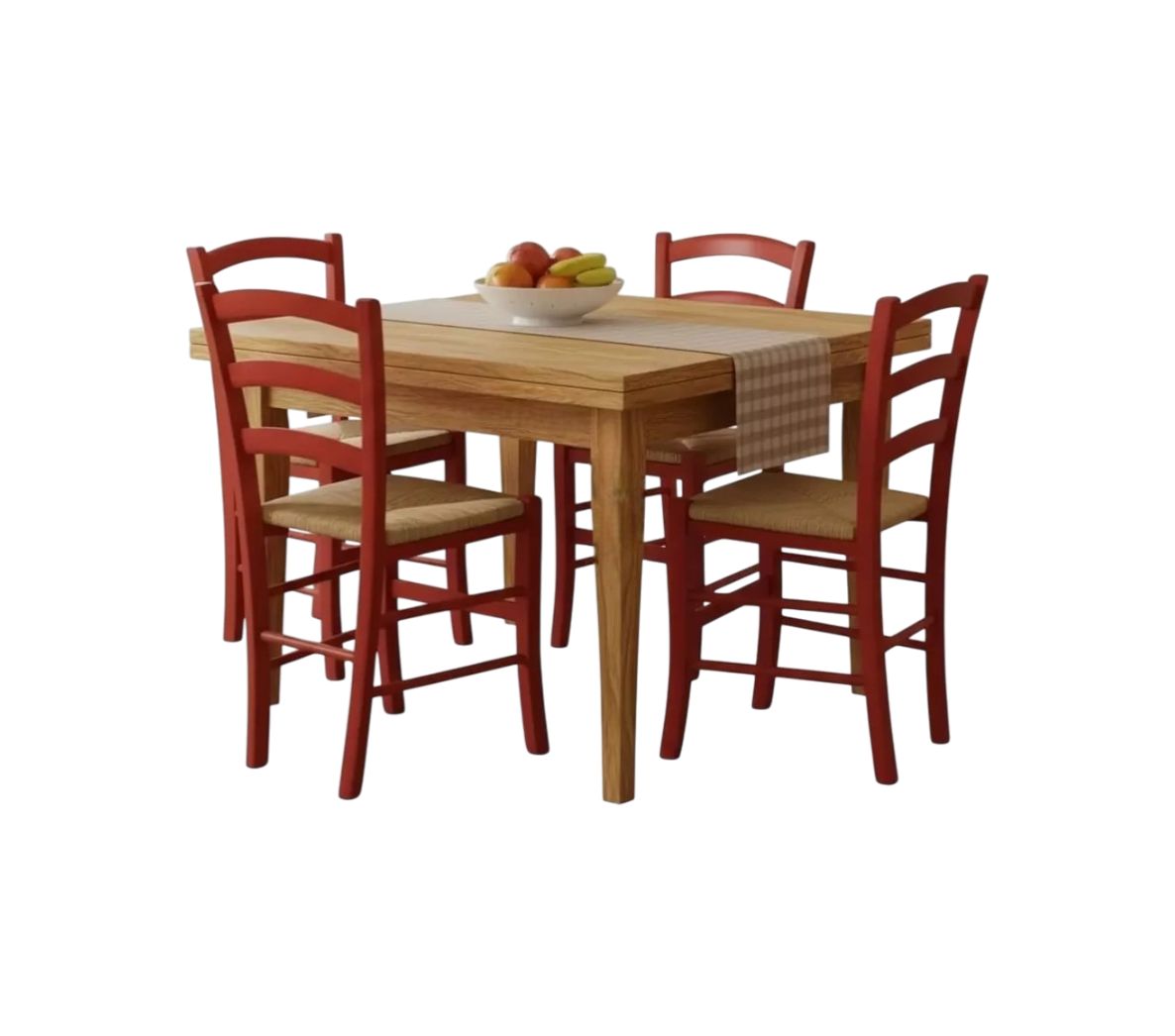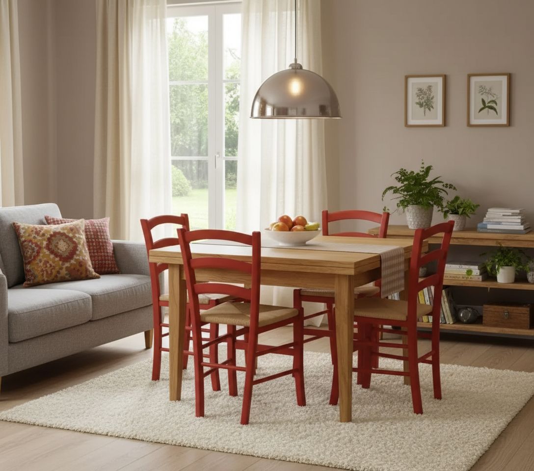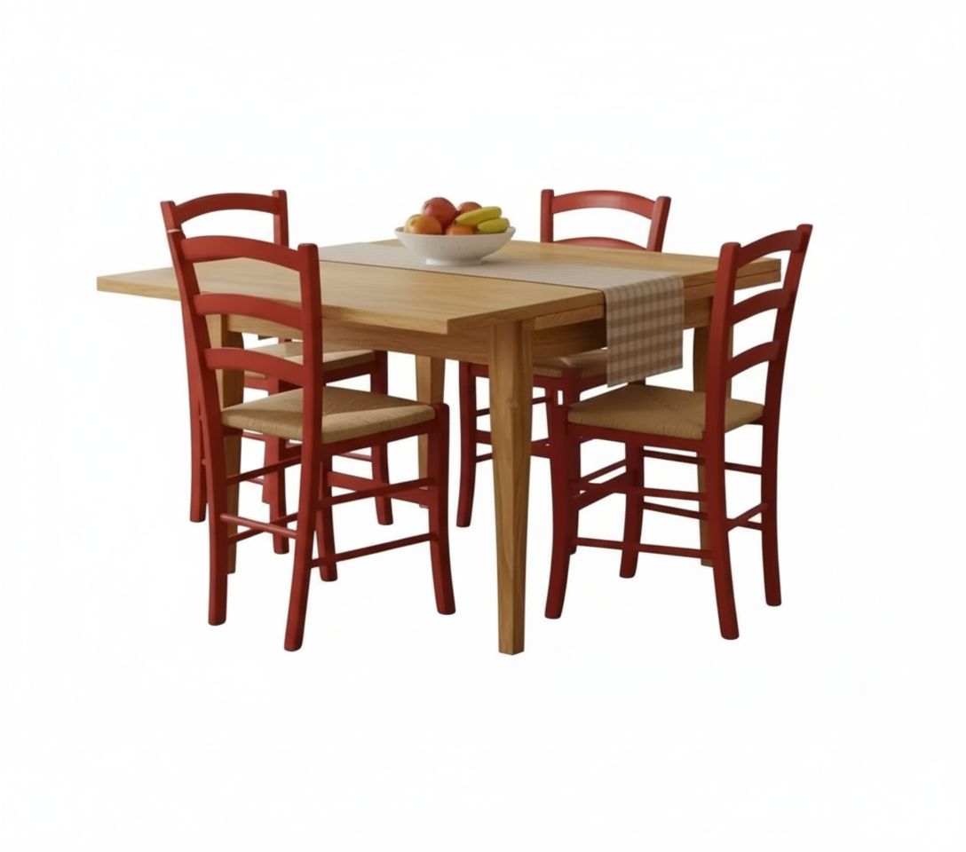Set tavolo quadrato a libro noce chiaro 90x90 100x100 allungabile con 4 sedie rosse
