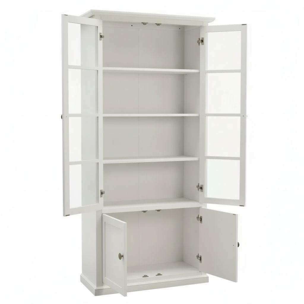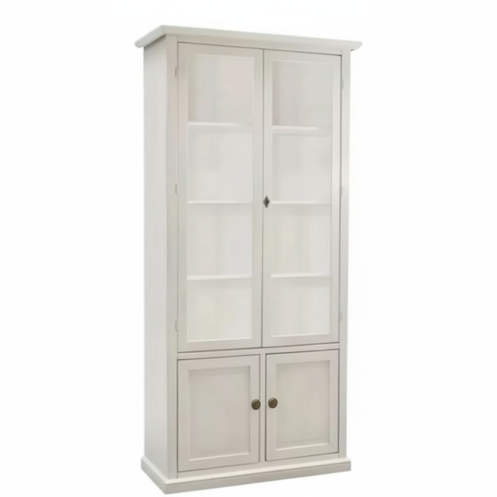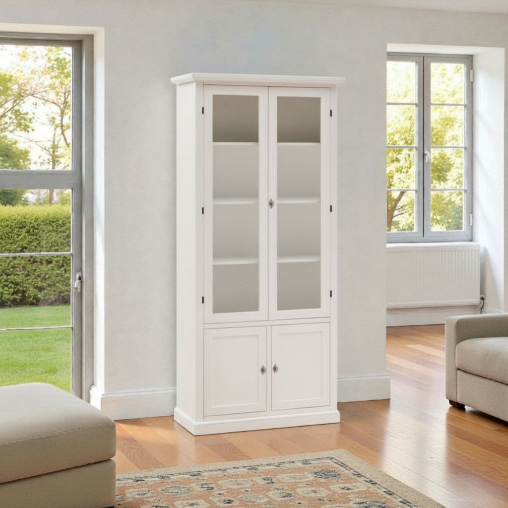 La finitura laccata bianco anticato, luminosa e versatile, dona alla vetrina un aspetto sobrio e raffinato, che la rende adatta ad ambienti arredati in stile tradizionale, shabby chic o moderno. Le due ante in vetro permettono di esporre oggetti, ceramiche, libri o bicchieri, mentre le due ante inferiori in legno offrono uno spazio utile per riporre stoviglie, tessili o altri oggetti che si desidera tenere fuori dalla vista.