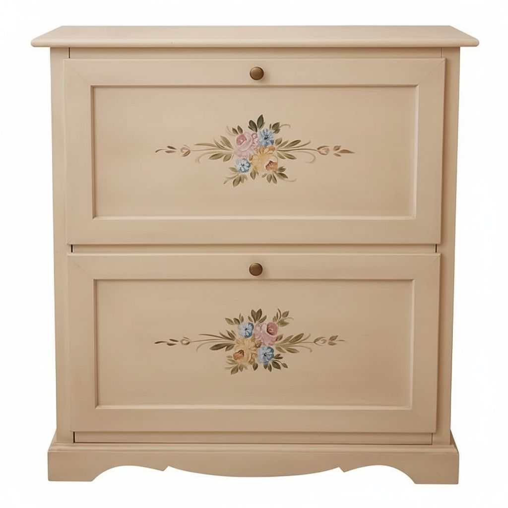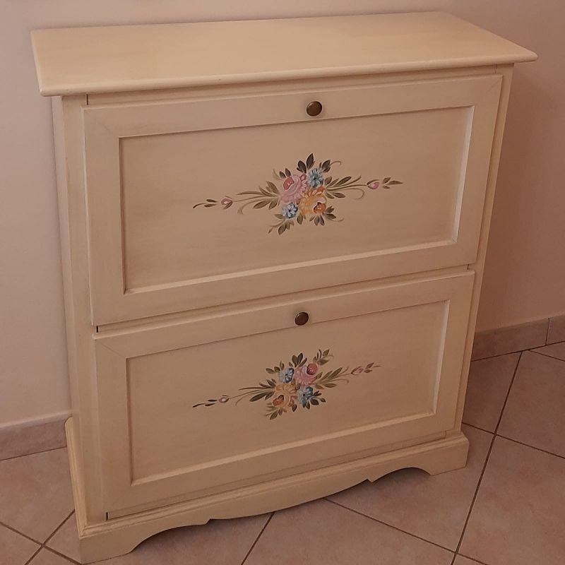 Scarpiera 2 ante ribalta legno shabby avorio anticato decori 79X30X90
