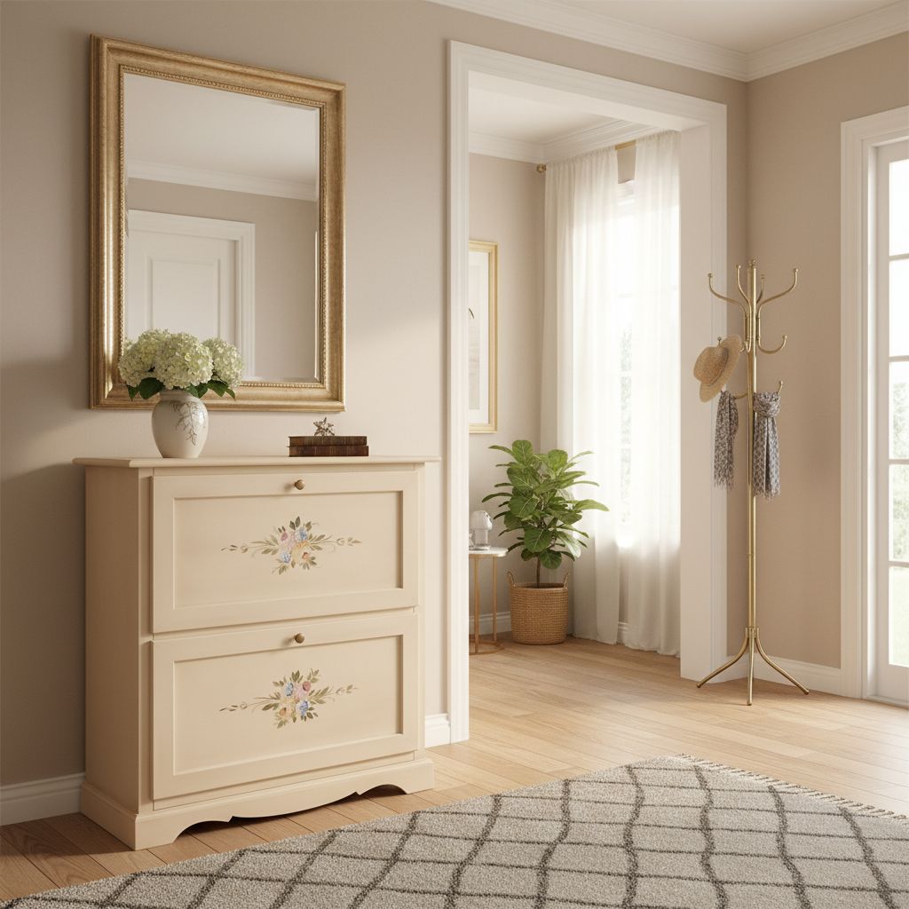 Meravigliosa scarpiera bassa in stile shabby chic, perfetta per chi desidera mantenere l’ingresso o la zona giorno sempre in ordine, valorizzando gli ambienti con il fascino e l’eleganza dell’arredo classico.