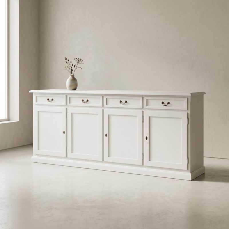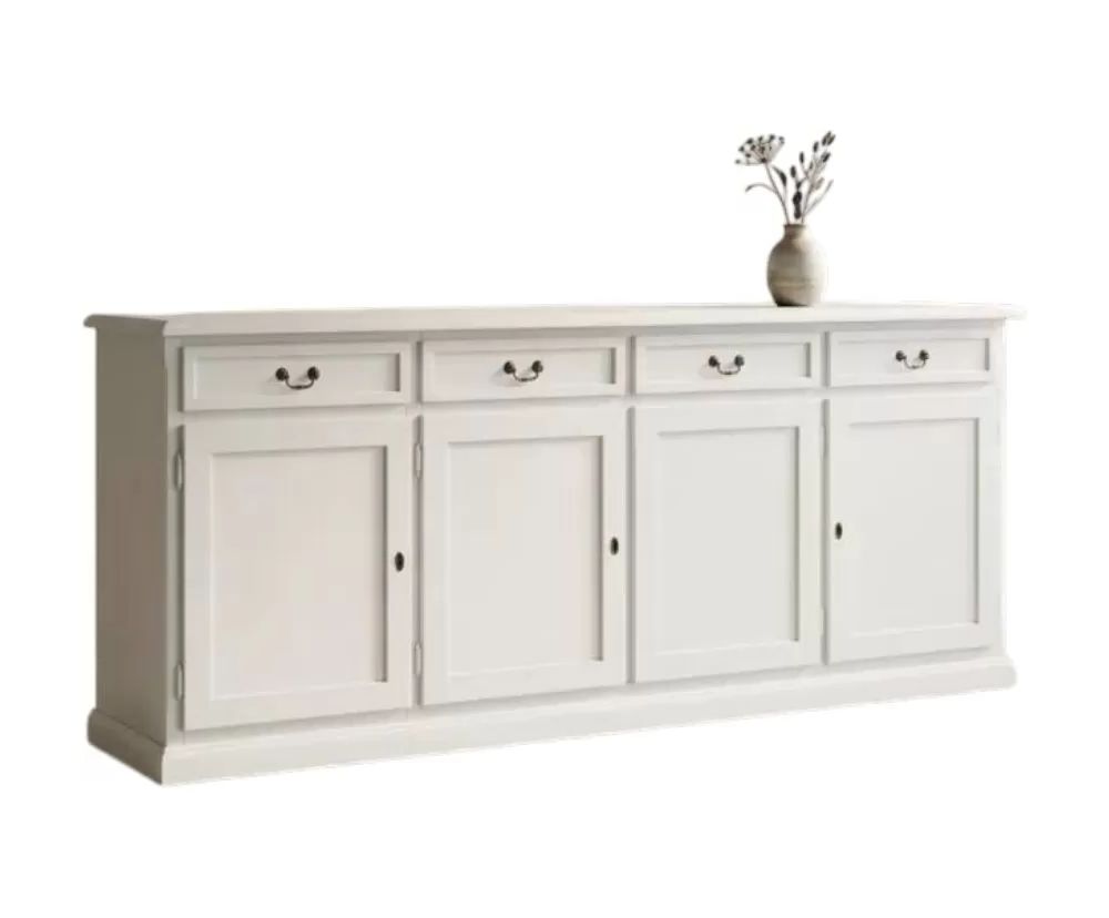 Madia in stile shabby che ti permetterà di riporre i tuoi servizi da tavola. Nella parte inferiore è dotata di 4 cassetti, 4 porte e un ripiano fisso all'interno. Solida e robusta ma allo stesso tempo la rende funzionale sfruttando i cassetti e il ripiano interno. Ideale per la zona del salotto o come mobile per l'entrata ottimizzando gli spazi.