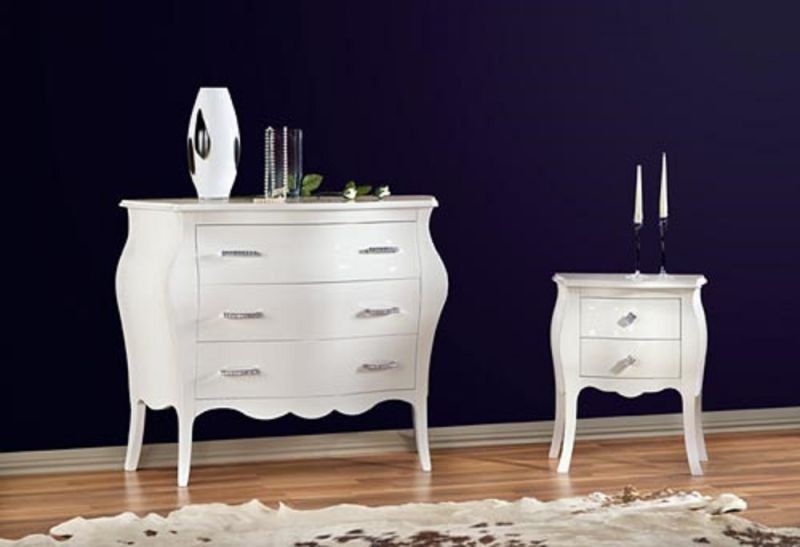 Gruppo cassettiera e Comodini costruiti in legno con angoli smussati e gambe a sciabola. Cassettiera e comodini dotati di cassetti per riporre all'occorrenza biancheria intima e oggetti. Trovano facilmente posto nella zona notte proteggendo con i suoi cassetti il suo contenuto all'interno. Unici nel loro genere con i pomoli swarovski dando un tocco a un' atmosfera dallo stile romantico.