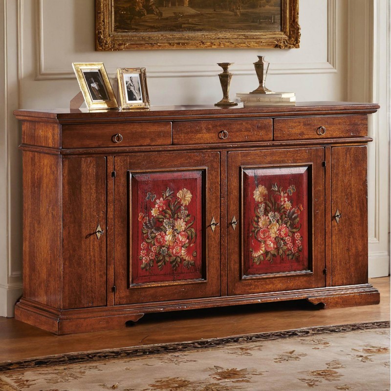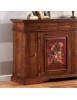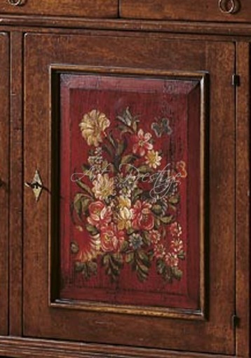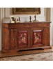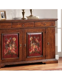 La credenza è rifinita tinta noce scuro anticato con effetto anticato e tarlato.