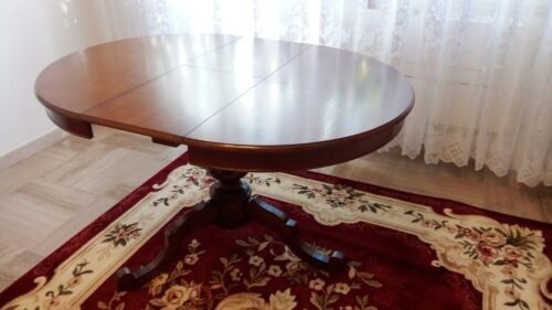tavolo tondo con gambone centrale e gambe sagomate, diametro 100 cm con 1 allunga da 40 cm a scomparsa con apertura a planare