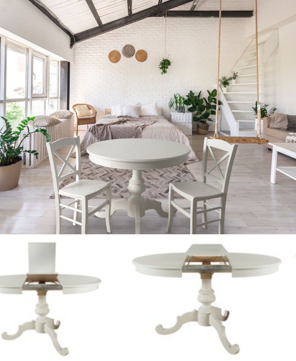 TAVOLO ARTE POVERA ROTONDO COLORE BIANCO OPACO D.100, 1 ALLUNGA 40 CENTIMETRI