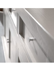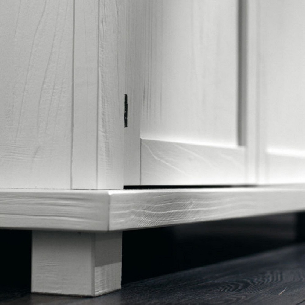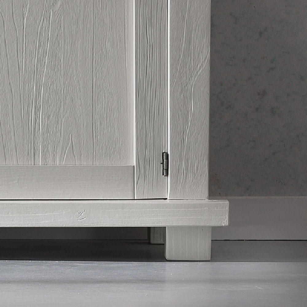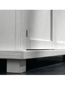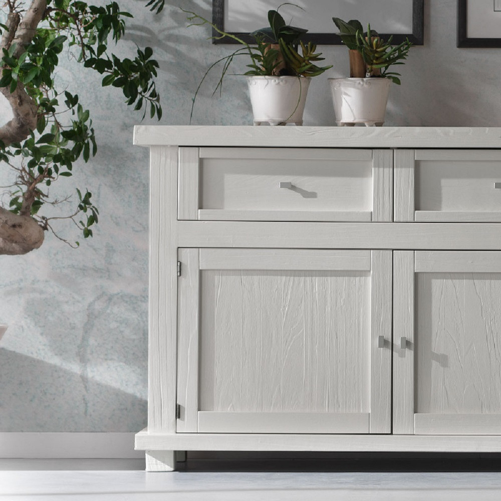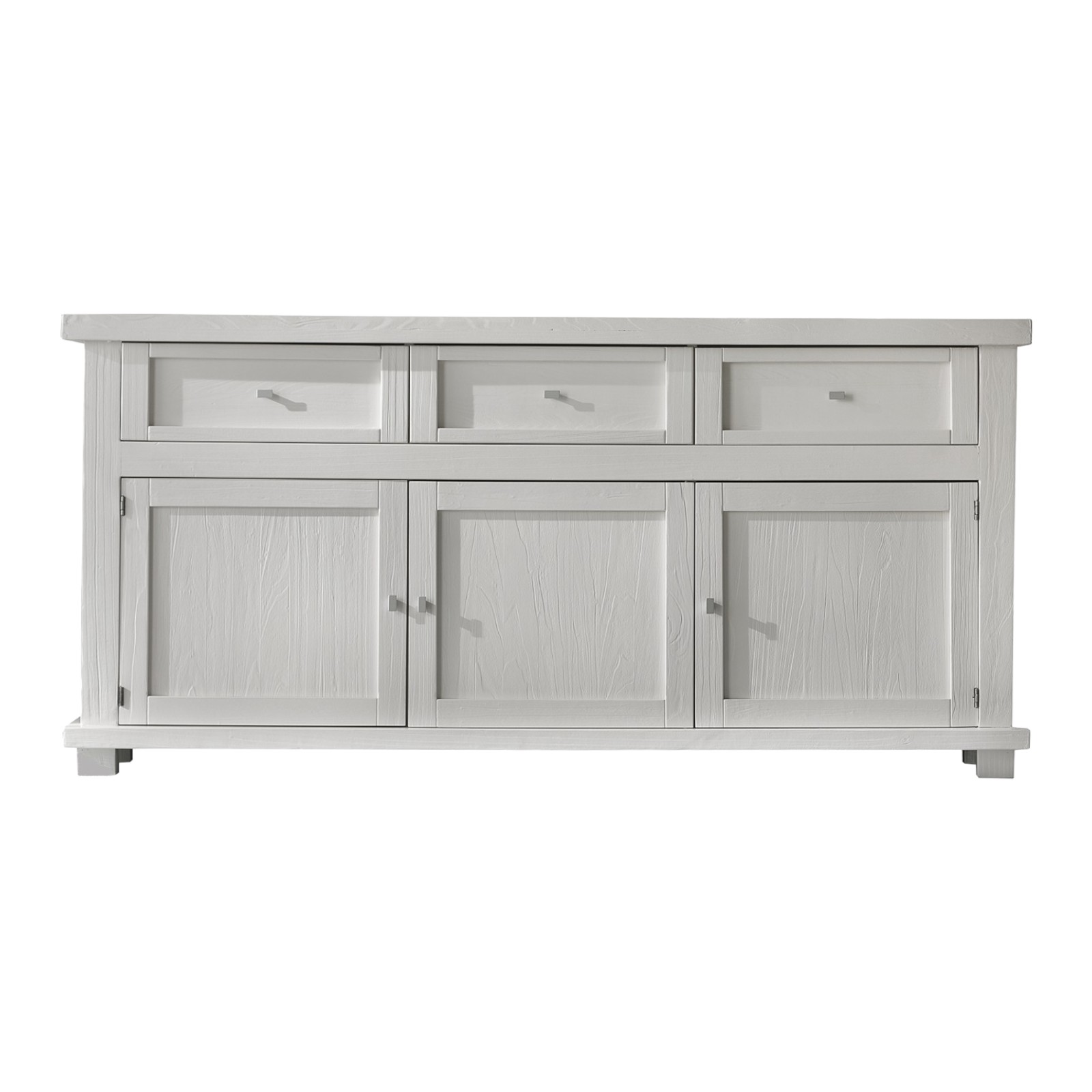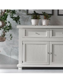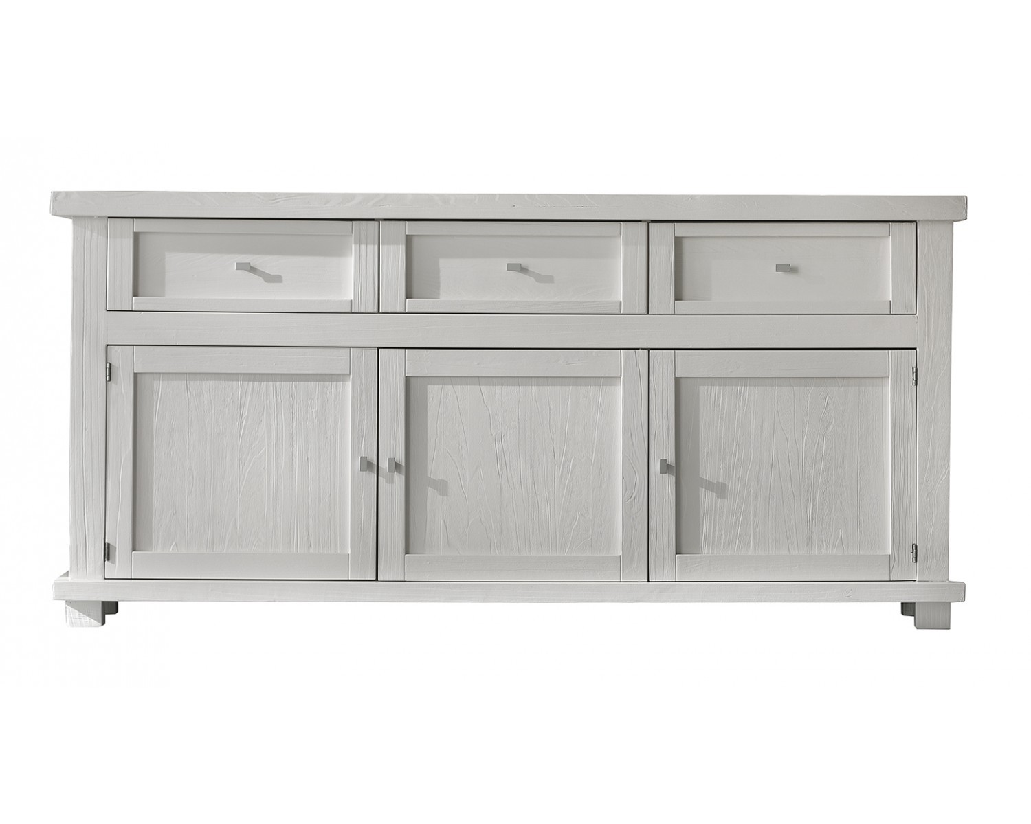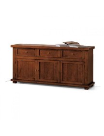 Credenza tre ante e tre cassetti. Sotto al piano sono inseriti tre cassetti riquadrati con cornice semplice e rigorosa. Schienale di forte spessore diamantato. Questo mobile si caratterizza per la costruzione interamente con legno massello e la purezza della forma. Grazie alla pulizia delle sue forme, si può adattare ad ambienti shabby o di gusto rustico. Cassetti con incastri a coda di rondine.