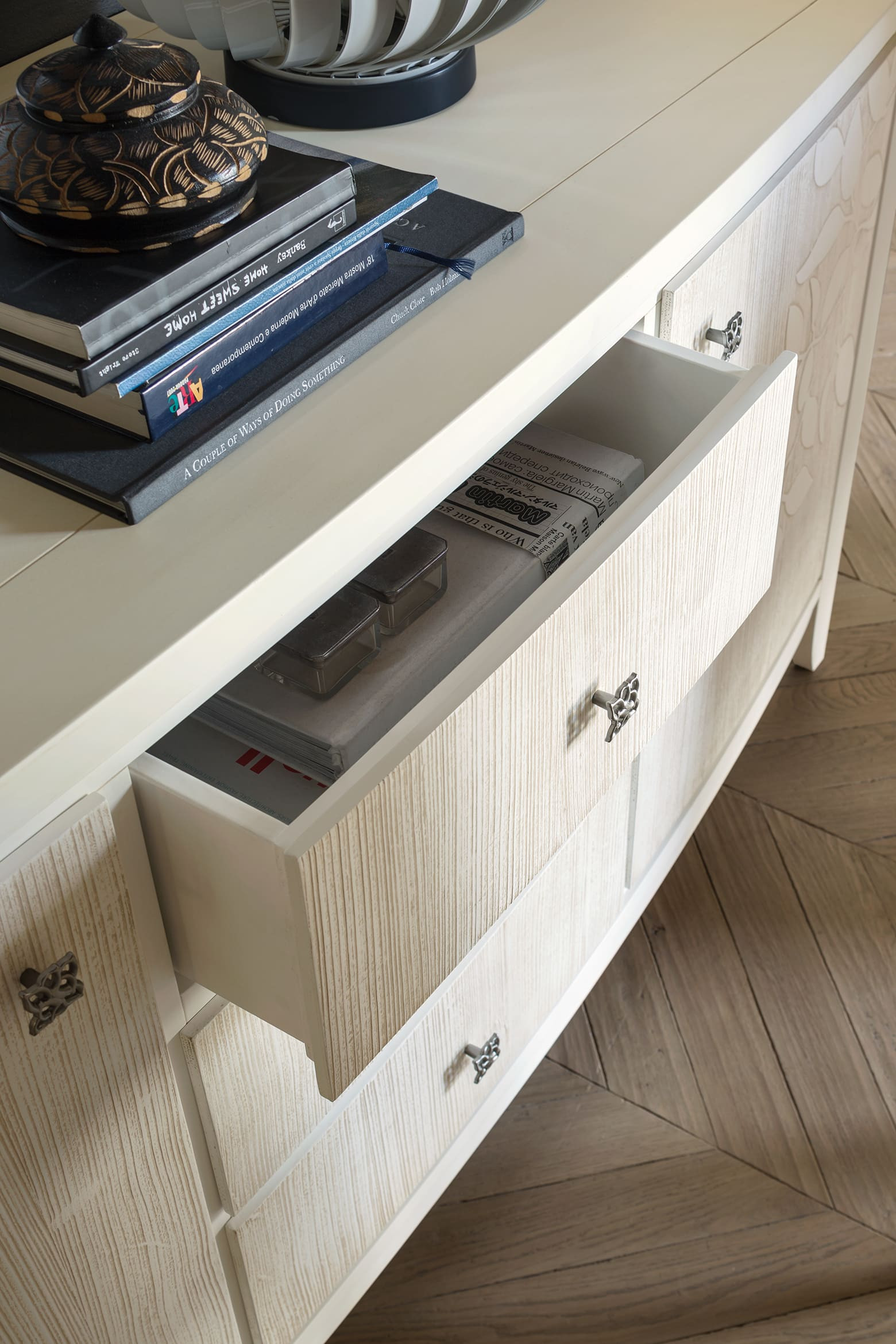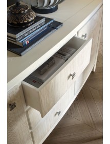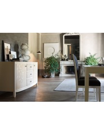 Credenza due ante con decoro con foglia e tre cassetti . Sotto al piano sono inseriti tre cassetti con cornice semplice e rigorosa. Schienale di forte spessore . Questo mobile si caratterizza per la costruzione interamente con legno massello e la purezza della forma. Grazie alla pulizia delle sue forme, si può adattare ad un ambiente contemporaneo di gusto moderno.