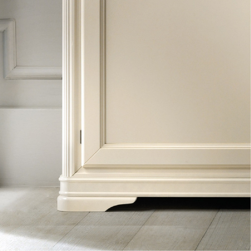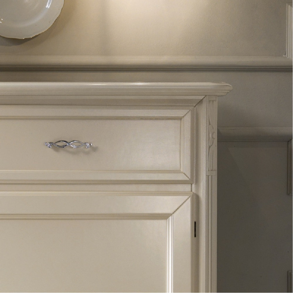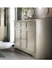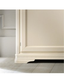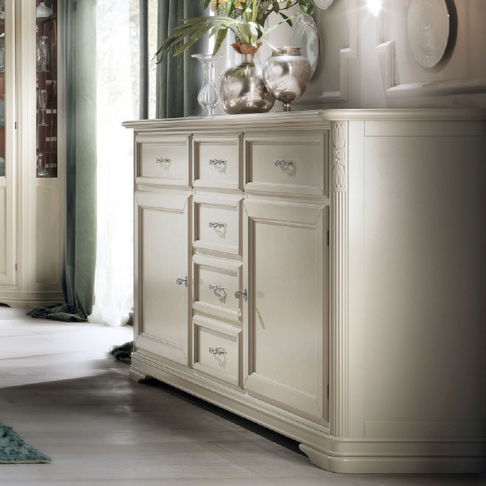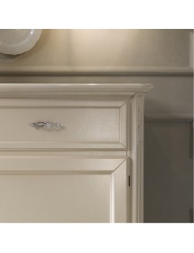 Credenza con due ante e sei cassetti di gusto shabby, caratterizzata da piccoli elementi intagliati e da profili molto decorativi. Questa credenza è dotata di due ante quadrate con serratura, separate da una fila di quattro cassetti. Sopra le ante sono presenti due ulteriori cassetti più ampi dei precedenti. Cassetti con frontale incorniciato, ante con profilo in legno. Spalle leggermente intagliate.