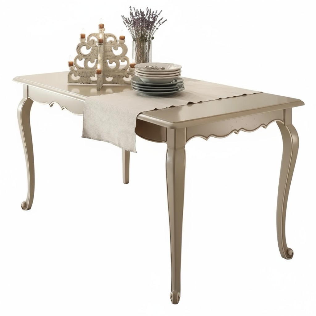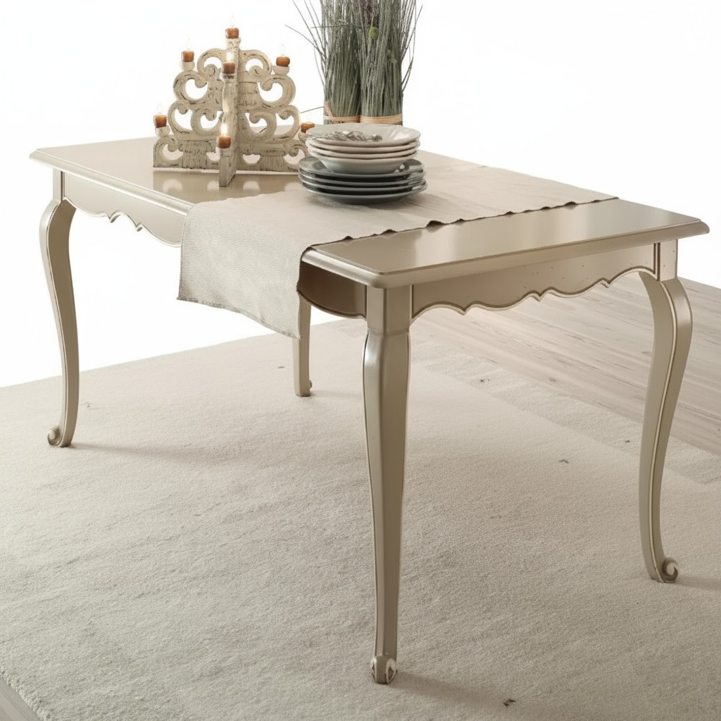 Tavolo rettangolare allungabile con apertura al centro, dotato di due allunghe da cm 40, gambe sagomate con parte terminale lavorata a ricciolo. Fascia sotto piano a più volute con incisione.